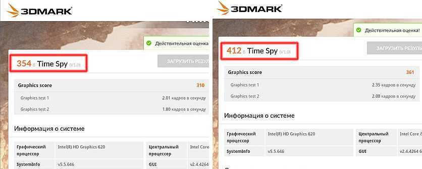 Для примера сравните результаты бенчмарка 3D Mark, запущенного на ноутбуке Lenovo Thinkpad T470. На первом скриншоте показан результат с одной планкой объёмом 8 ГБ. На втором — с двумя модулями по 4 ГБ. Суммарный объём памяти остался неизменным, но общая оценка выросла на 16% благодаря использованию двухканального режима.