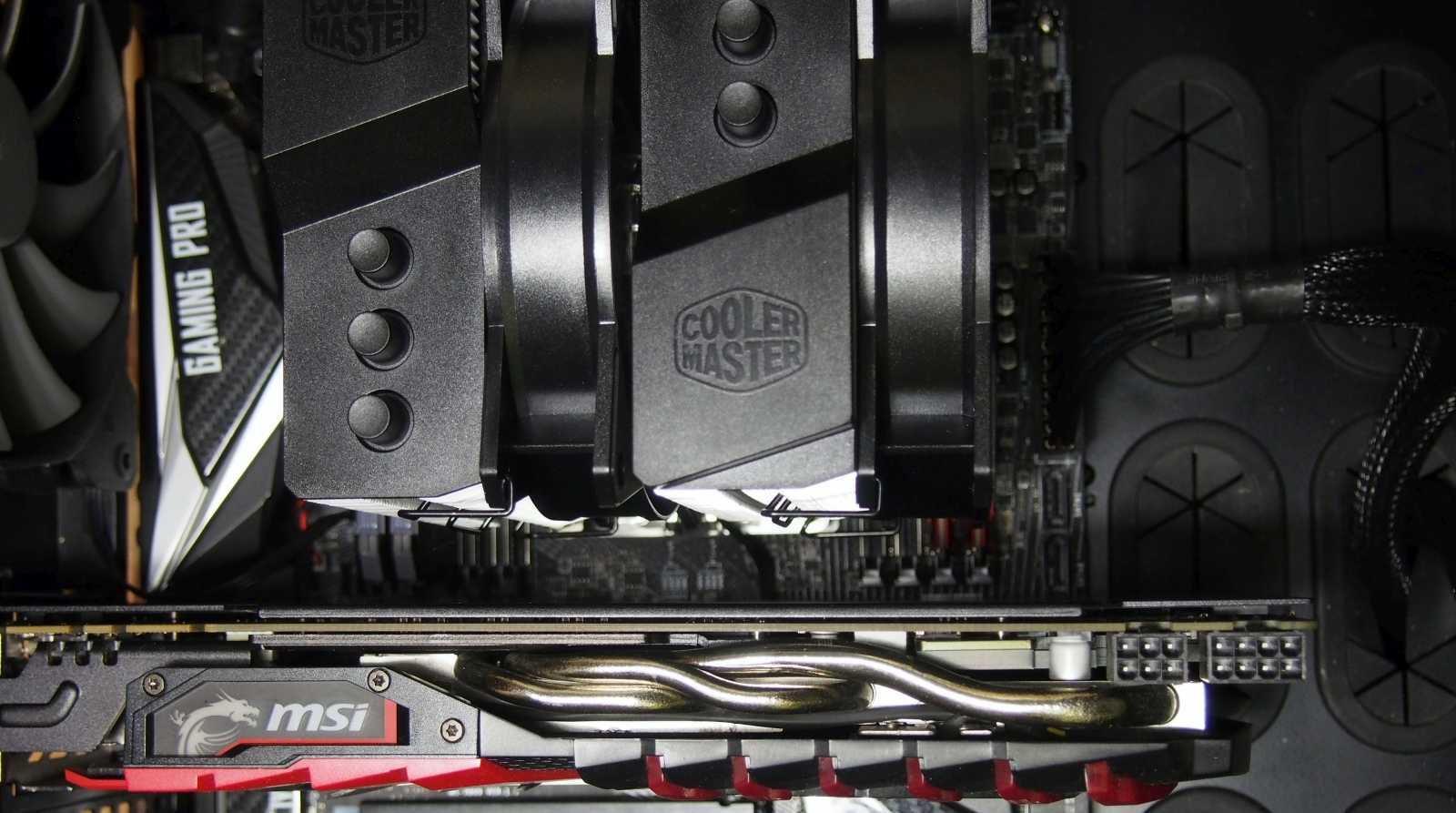 Для установки видеокарты в первый слот PCI-E x16 процессорный охладитель не предоставил никаких проблем.