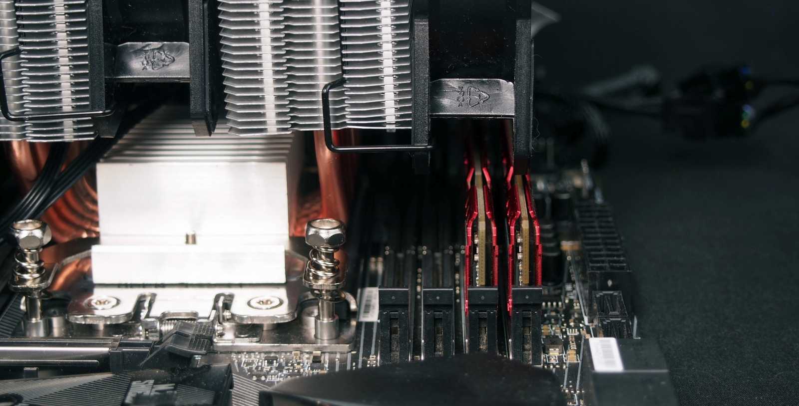 С левой стороны кулер перекрывает доступ к двум крайним слотам DIMM. Два дальних слота доступны даже после установки охладителя, и высоким модулям здесь MasterAir MA621P не мешает. Одна незадача, что установить наши тестовые Corsair Vengeance RGB Pro в правильный 4-канальный режим в случае использования MasterAir MA621P не представляется возможным. Поэтому два модуля с левой стороны мы использовали лишь для демонстрации ограничений, накладываемых охладителем.