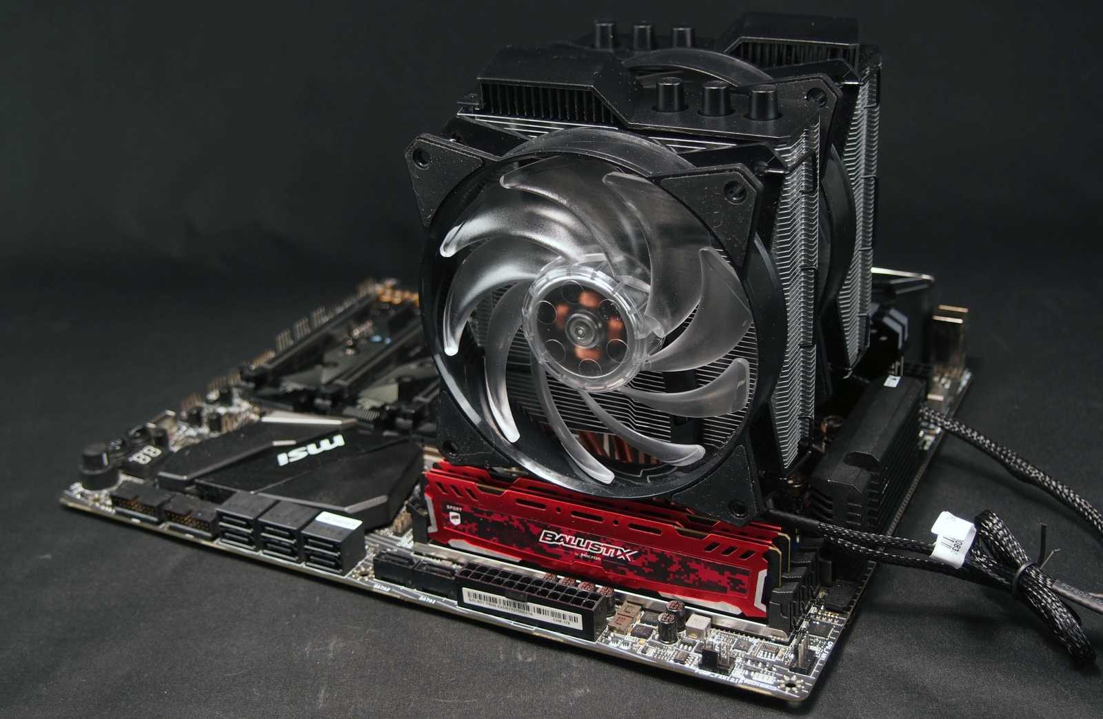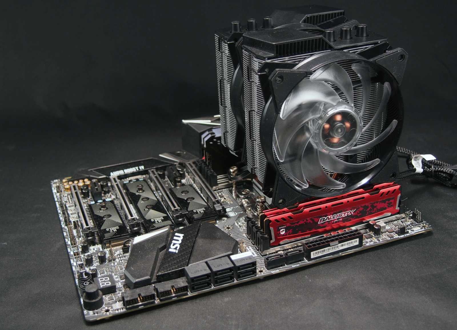 Смотрится на материнской плате охладитель MasterAir MA621P массивно, но не монструозно. Для оперативной памяти, согласно габаритной схеме производителя, отводится 35.6 мм пространства по высоте. Поэтому наши штатные Crucial Ballistix встали без особых проблем, чего не скажешь о более высоких Corsair Vengeance RGB Pro.