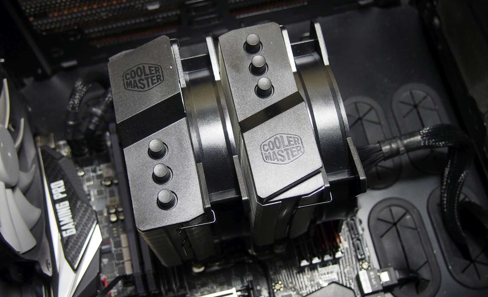 Внешний вид системы охлаждения MasterAir MA621P внутри корпуса ПК крупным планом.