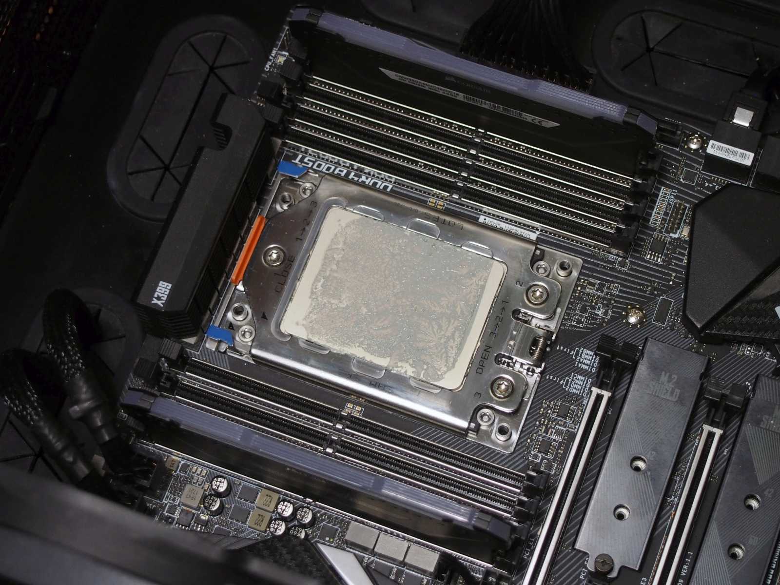А причина, почему нам пришлось снять материнскую плату и установить кулер MasterAir MA621P вне корпуса ПК, кроется в этих двух винтах. Свободного пространства, чтобы подлезть с комплектным шестигранным ключом и закрутить данные винты, совершенно не остается. Поэтому охладитель MasterAir MA621P реально поставить на материнскую плату только вне корпуса, а уже затем монтировать плату вместе с установленным охладителем в корпус обратно.