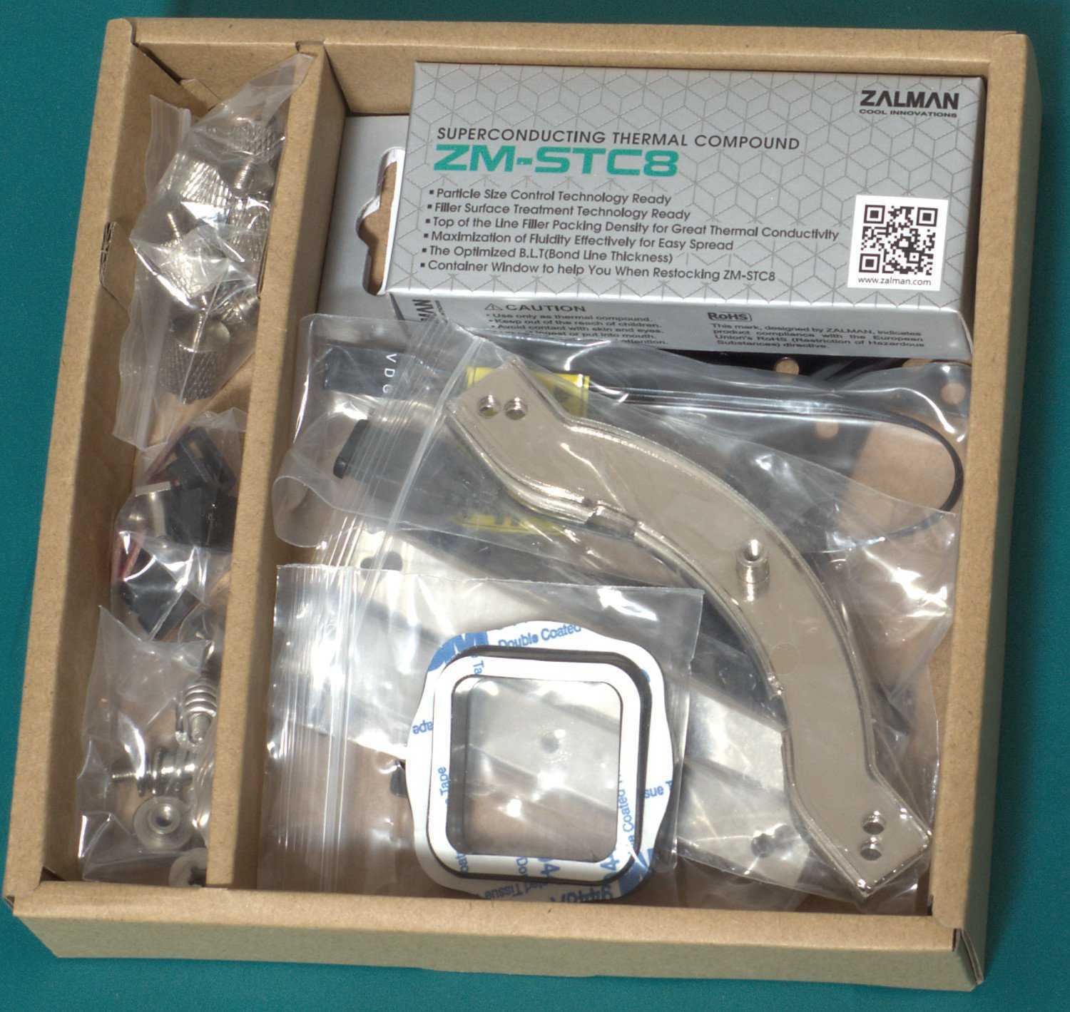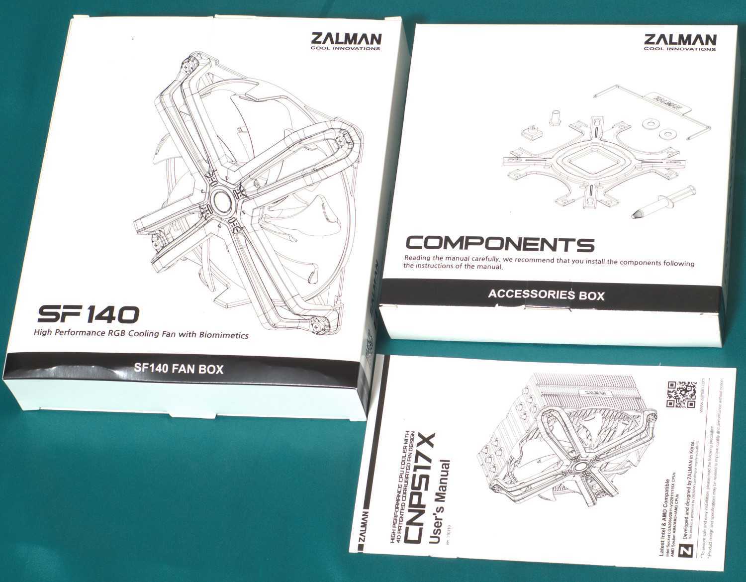 Комплектация напоминает старшего собрата Zalman CNPS20X. Отличия заключаются в меньшем количестве коробок (нет второго вентилятора Zalman SF140).