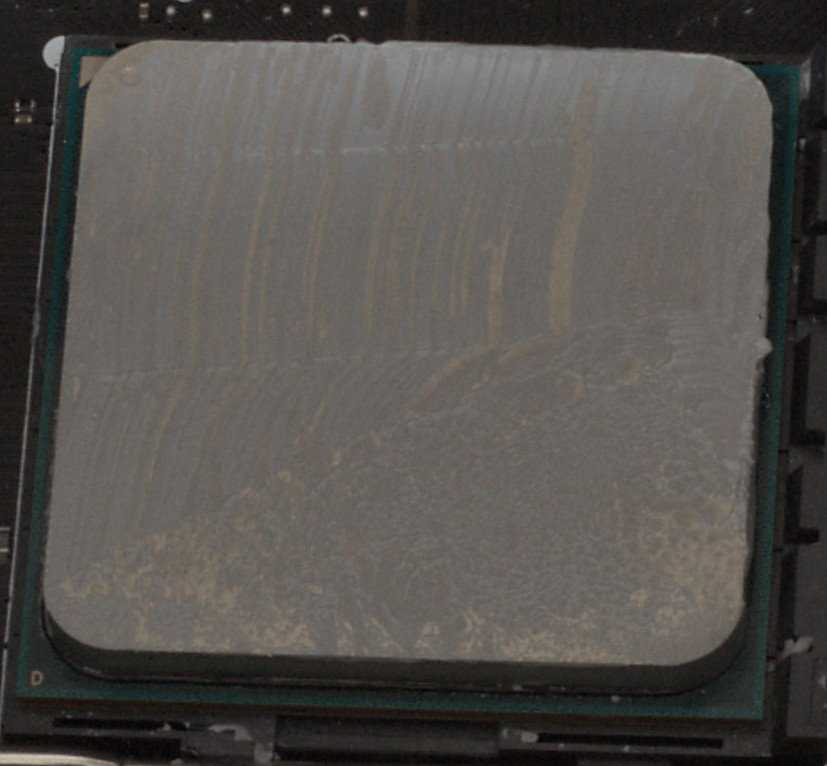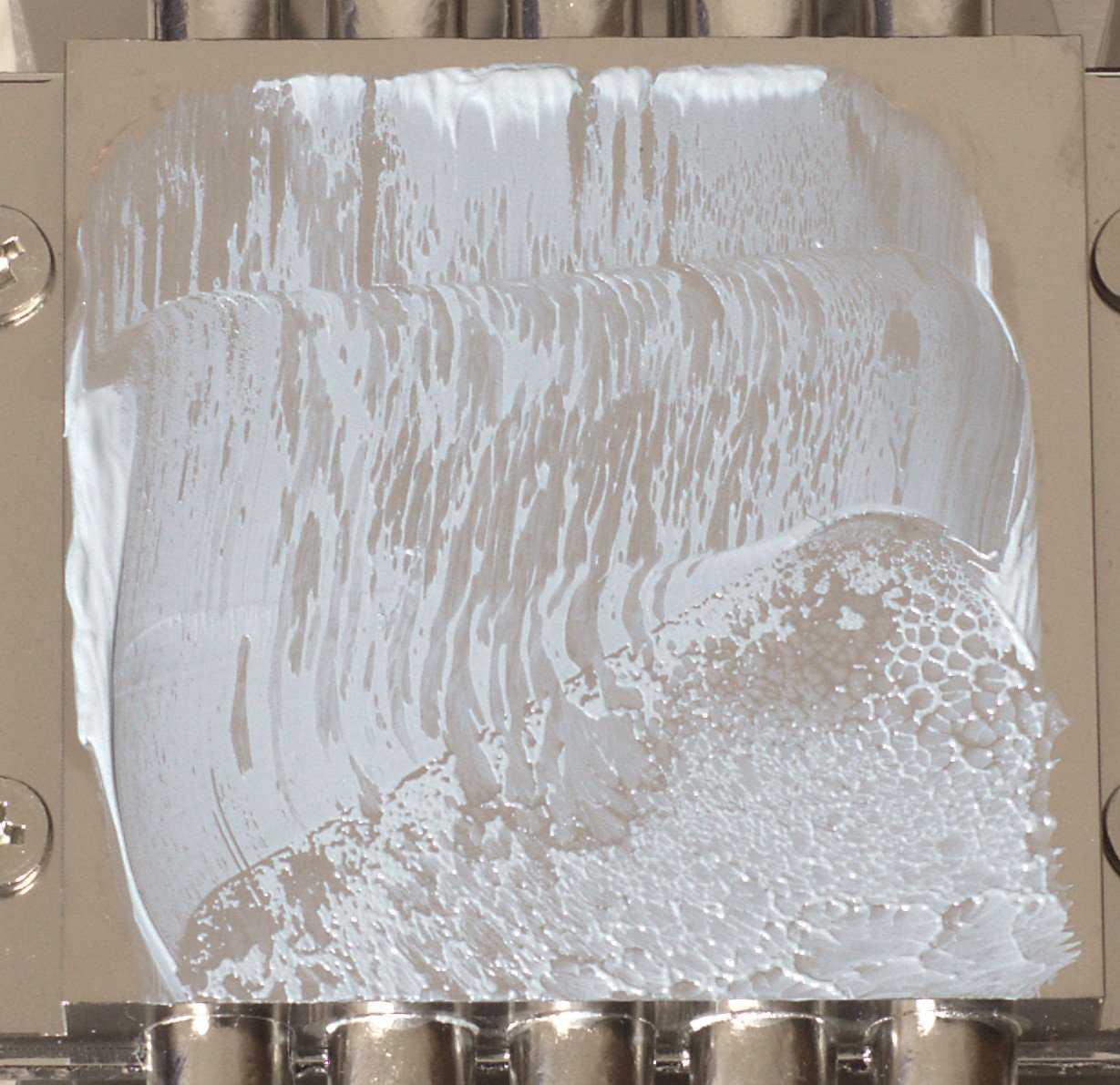 К основанию претензий нет – качество обработки хорошее, в одной плоскости есть небольшая вогнутость, но это не помешало получить хороший прижим, так как после снятия радиатора процессор «прилип» к основанию и его пришлось смещать, поэтому отпечаток в конечном счете смазанный.