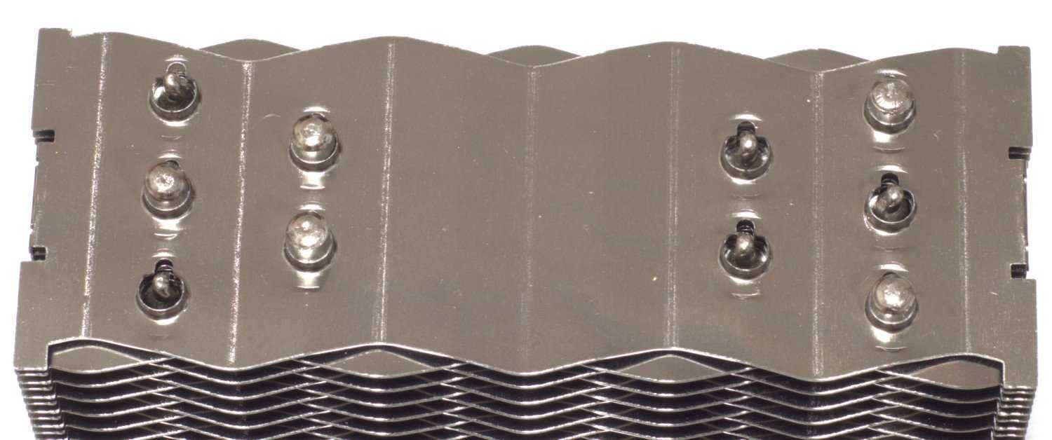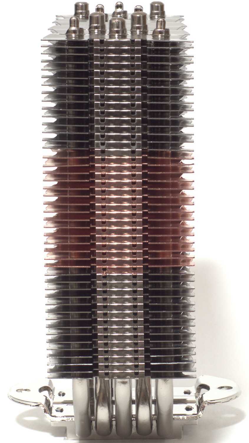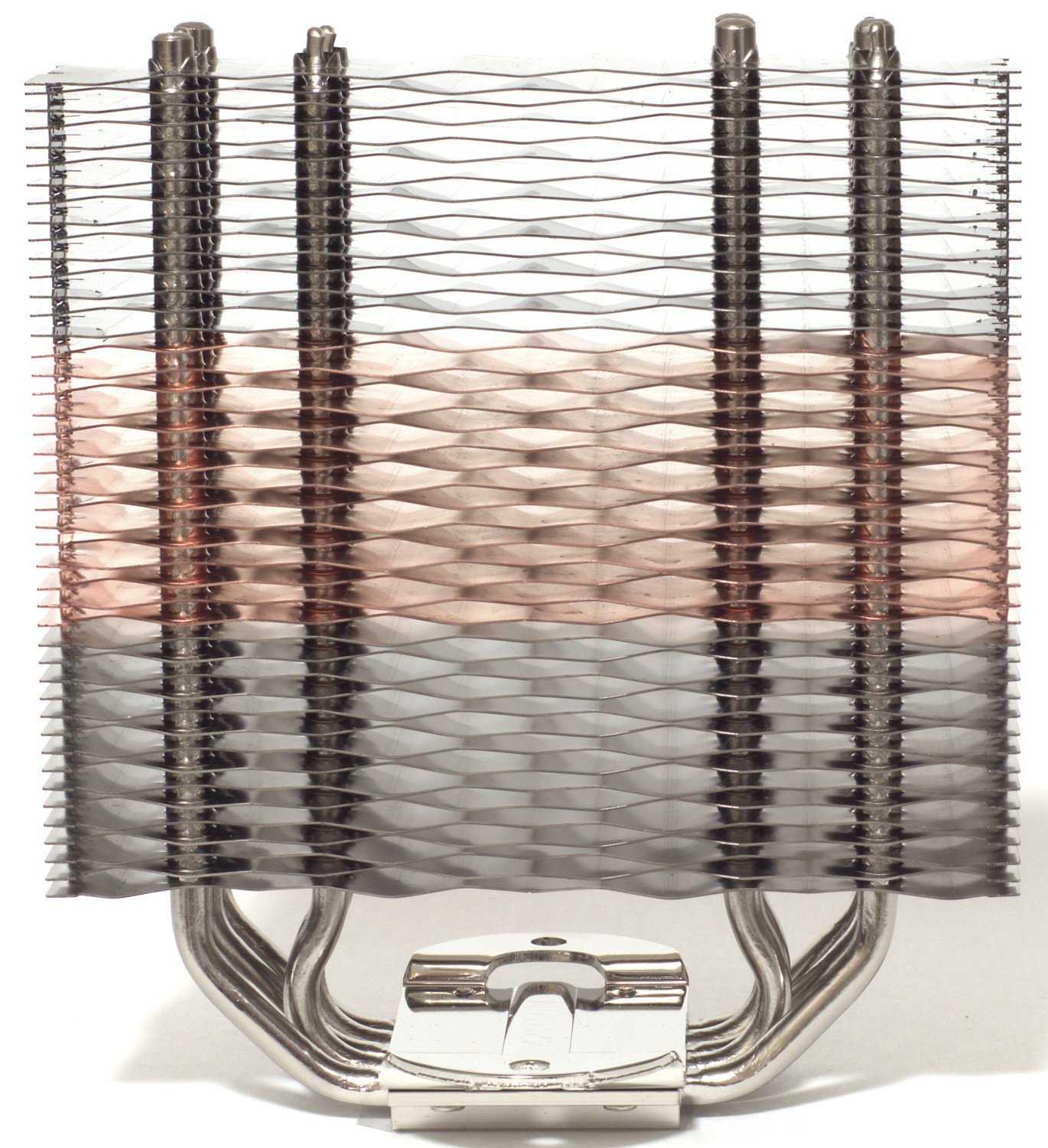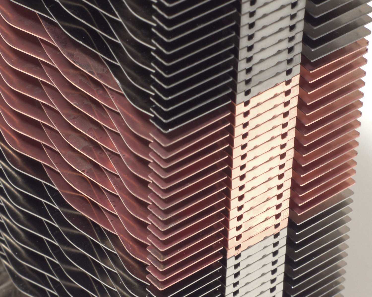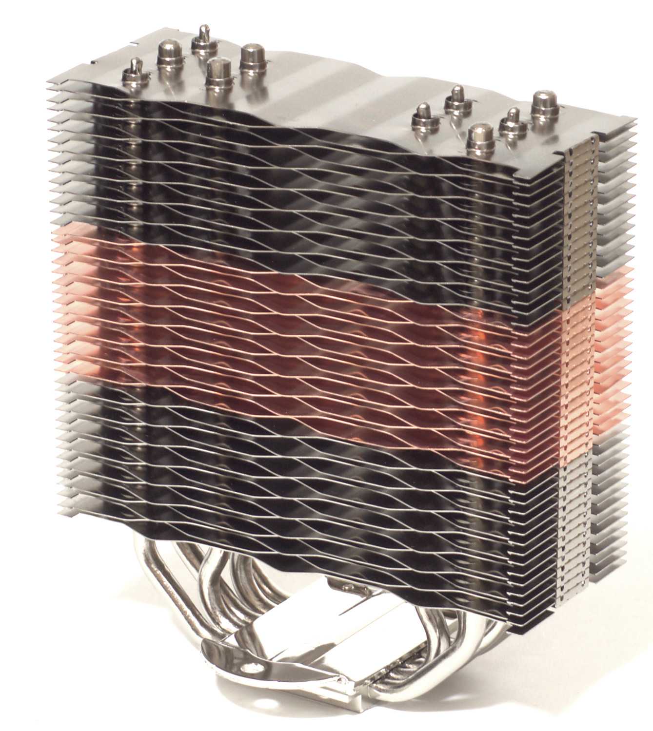 Еще одно изменение относительно старшей модели – количество медных 6 мм тепловых трубок уменьшено с шести до пяти, хотя общее количество и компоновка пластин (15 алюминиевых + 15 медных + 15 алюминиевых) осталось прежним.
