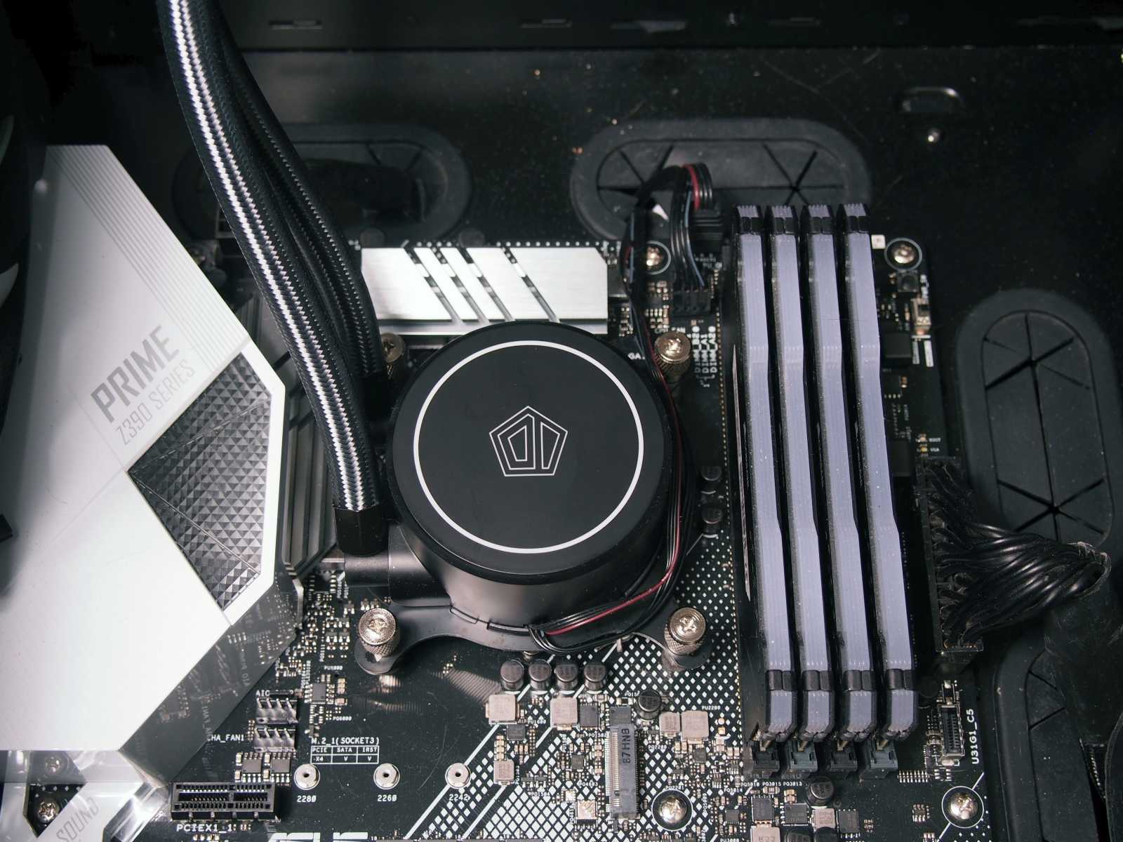 Следующим шагом пользователю остается закрепить радиатор ID-Cooling Auraflow X 360 к корпусу ПК, предварительно смонтировав к радиатору комплектные 120-мм вентиляторы. После того, как все кабели подсветки RGB, питание помпы и питание вентиляторов подключены, можно запускать систему.