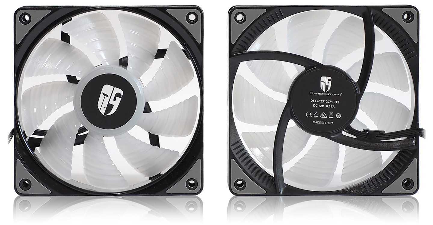 За охлаждение теплообменника отвечают два комплектных вентилятора DEEPCOOL GAMERSTORM DF1202512CM-012. Их корпус оборудован резиновыми вставками по углам для гашения вибрации во время работы. Крыльчатка выполнена из прозрачного пластика для работы в качестве рассеивателя для адресной RGB-подсветки.