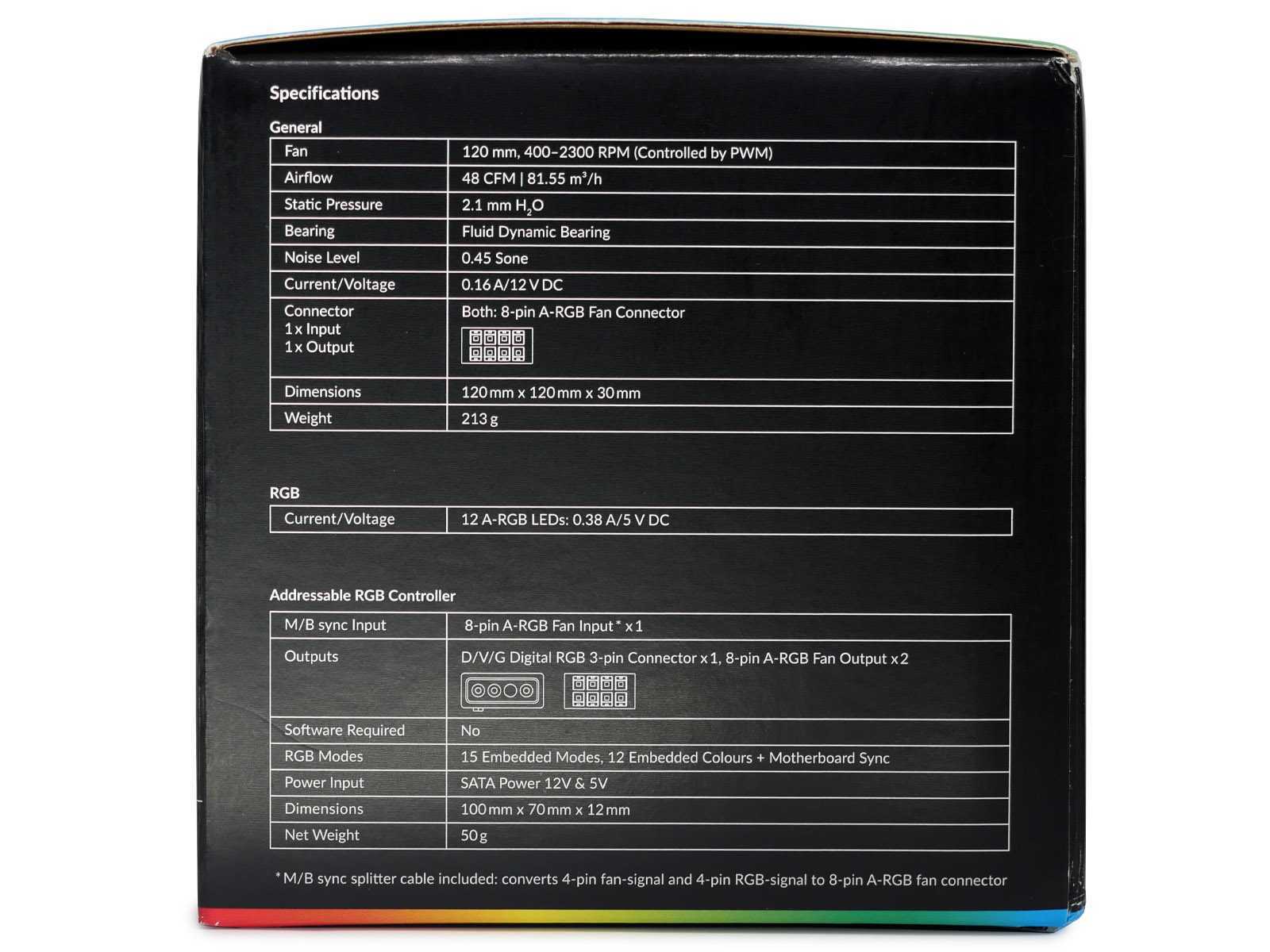 Комплект из трёх вентиляторов идёт в наборе с контроллером ARGB-подсветки. Упаковано всё в относительно небольшую коробку размером 130 x 125 x 125 мм. Оформление цветное, презентабельное.
