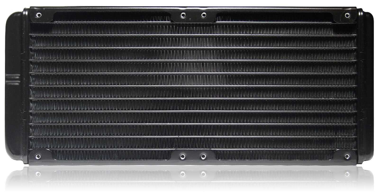 Использован стандартный алюминиевый радиатор, качественно окрашенный в черный цвет, с высотой каркаса 27 мм. Полезное тело чуть меньше — около 16 мм высотой и набранотринадцатью плоскими каналами толщиной 16 мм с плотным заполнением пространства гофролентой. Симметричные выступы со скругленными краями (свыше зоны 240-мм) по бокамиспользуются для ввода трубоки кольцевания контура — 18 мм.