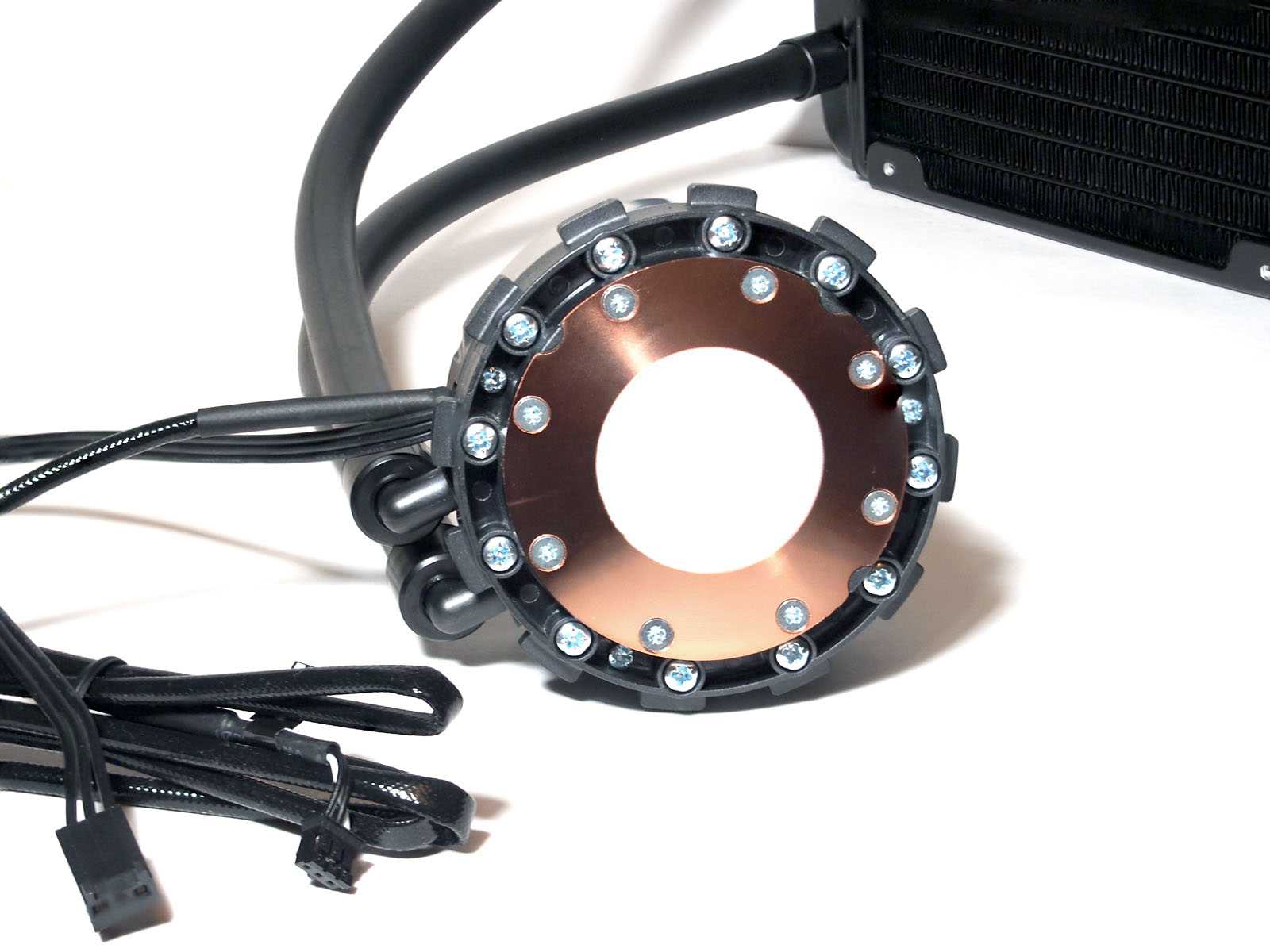 Соединение водоблока с радиатором осуществлено армированными шлангами длиной 32 см без дополнительной наружной нейлоновой оплетки (на официальномсайте продукт показан с ней).Со стороны радиатора используются прямые, со стороны помпы — «Г»-образные поворотные неразборные фитинги. Последний факт можно отметить как положительный, существенно снижающий напряжение шлангов и мест их опрессовки на установленной системе.