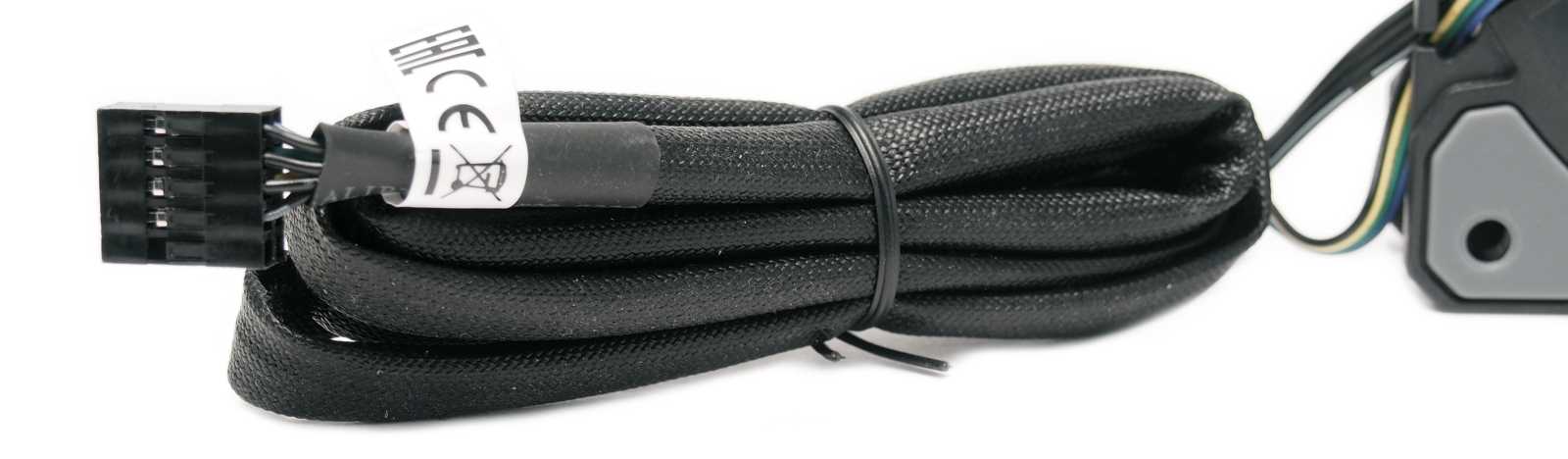 Кабели подключения на вентиляторах Riing Quad 12 RGB TT Premium обернуты в плотную защитную оплетку. Длины в 600 мм достаточно, чтобы протянуть их скрытно и в обход, сохраняя элегантный внешний вид сборки. Кабель имеет колодку разъема 9-пин, которая используется премиальными вентиляторами Thermaltake для подключения к контроллеру управления.