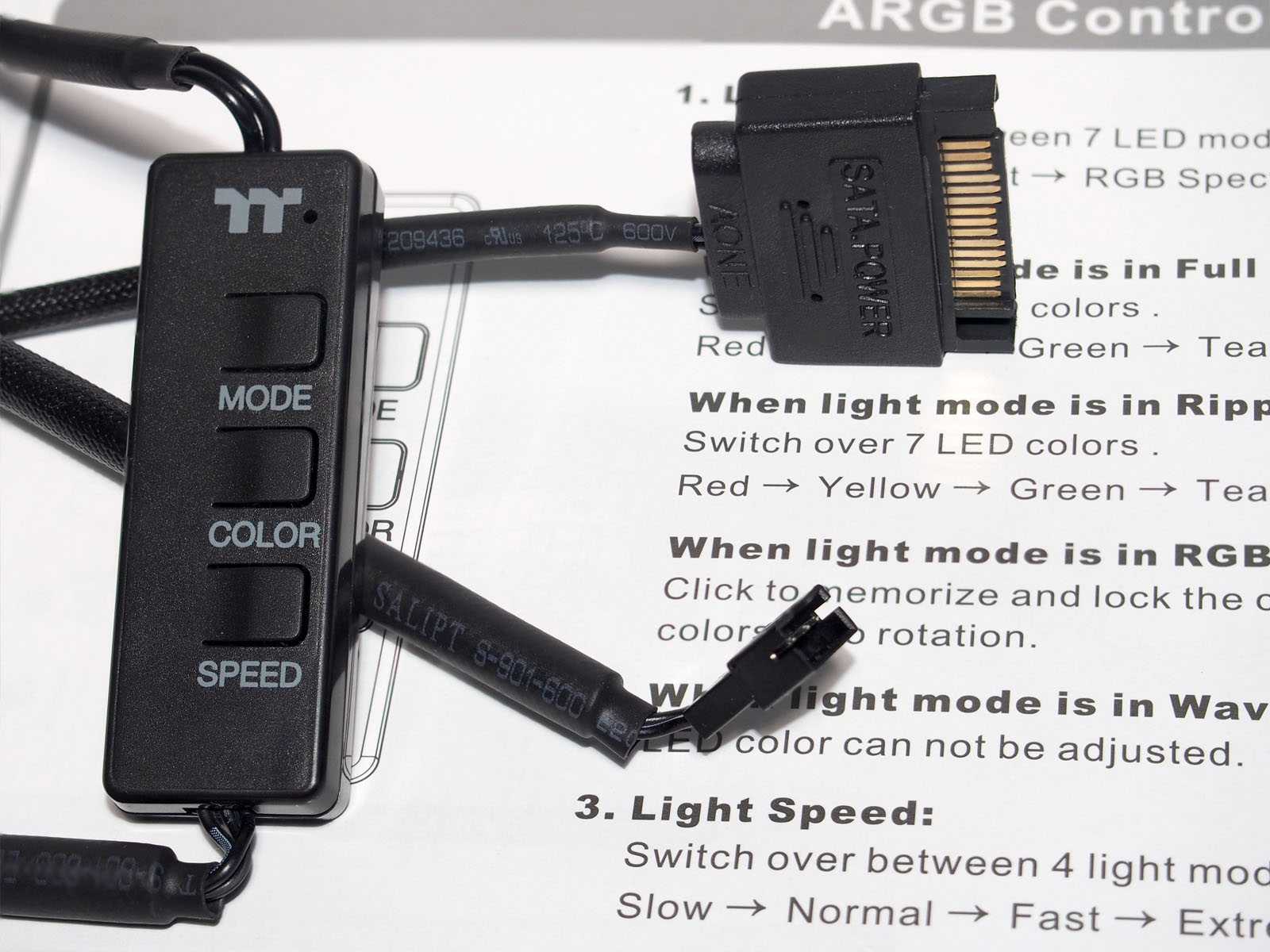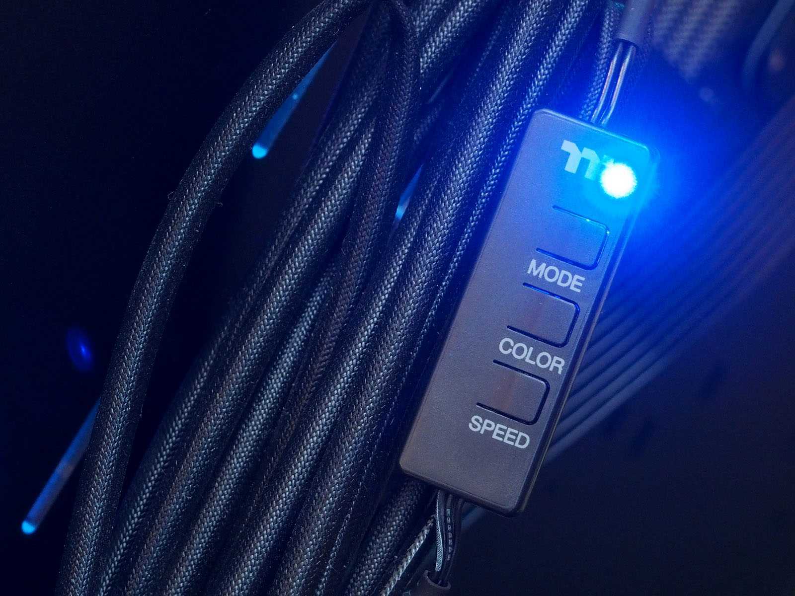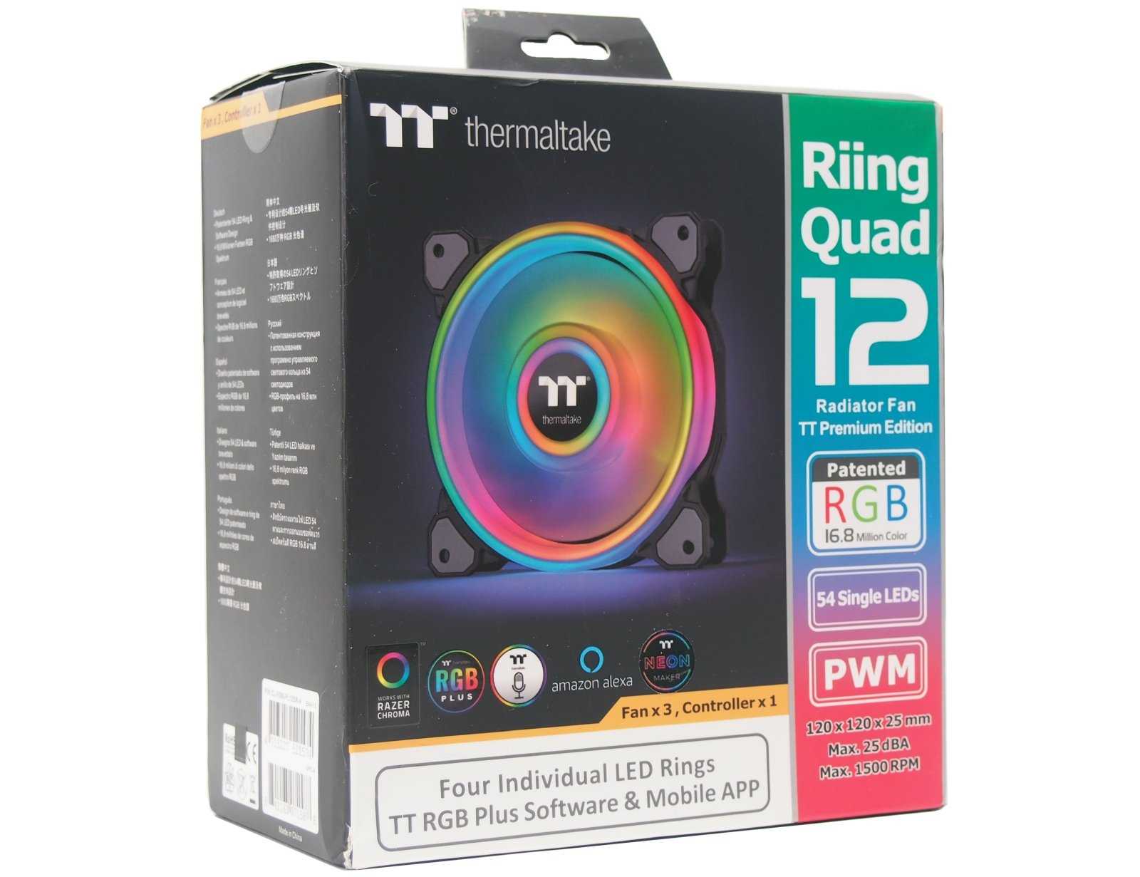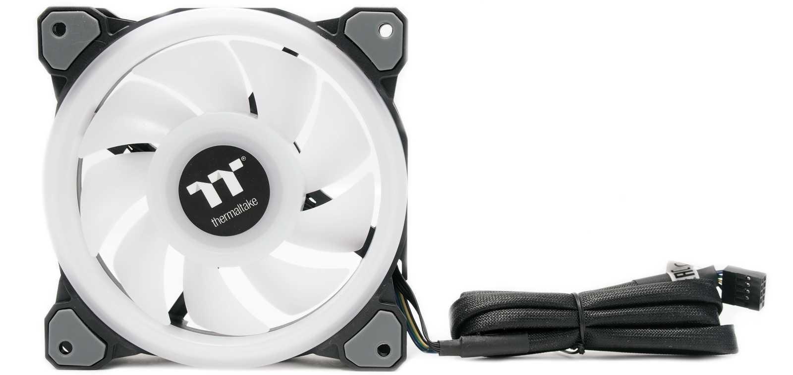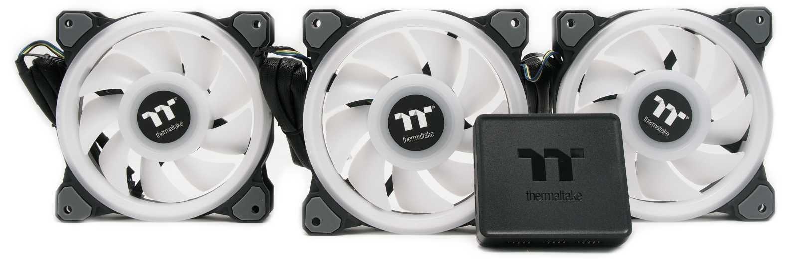 По сравнению с предыдущей линейкой Riing Trio, в новых вентиляторах Riing Quad 12 RGB TT Premium количество светодиодов было увеличено практически двое — с 30 до 54 штук. Собранные в четыре индивидуальных кольца подсветки, эти диоды формируют главную красоту RGB в новой серии вертушек. Контроллер управления является неотъемлемой частью комплекта Riing Quad 12 RGB TT Premium, поскольку именно с помощью него реализована настройка подсветки и скорости вращения вертушек.