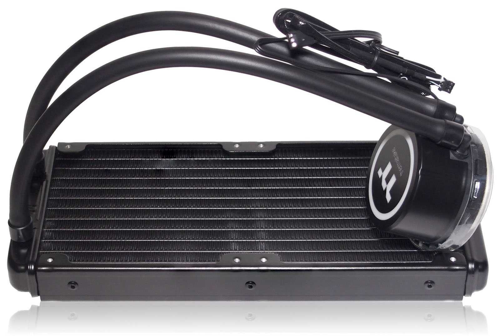 Классическая конструкция предзаполненныхсистемжидкостного охлаждения необслуживаемого типа существенно не меняется от одной модели к другой у разных производителей. Многие используютпатентованную конструкцию помпы и радиатора Asetek 570LXL и компоненты от этого же OEM-производителя. Различия касаются, как правило, только дизайна блока подсветки помпы с водоблоком, длины и стиля оформления шлангов и типа комплектных вентиляторов. Что и имеем вслучае с Thermaltake Water 3.0 240 ARGB Sync.