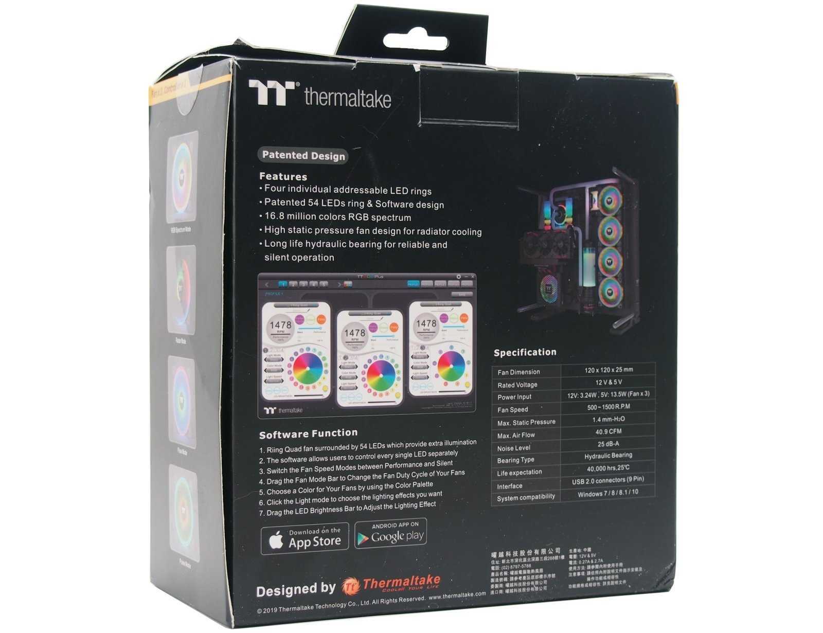 На тыльной стороне упаковки в деталях рассказывается о функциональности программного обеспечения TT RGB Plus. Отдельной таблицей размещены технические характеристики комплекта Riing Quad 12 RGB TT Premium.