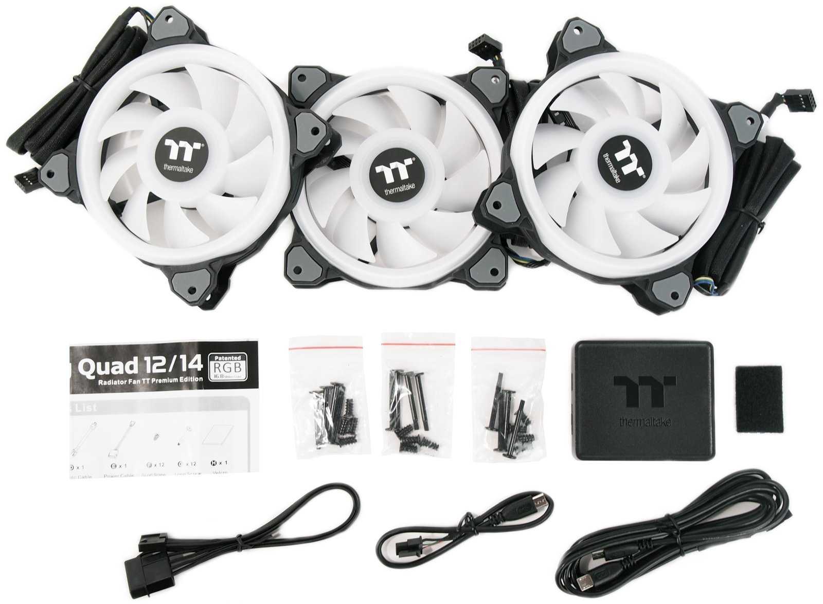 Полный комплект поставки Riing Quad 12 RGB TT Premium содержит следующие компоненты: