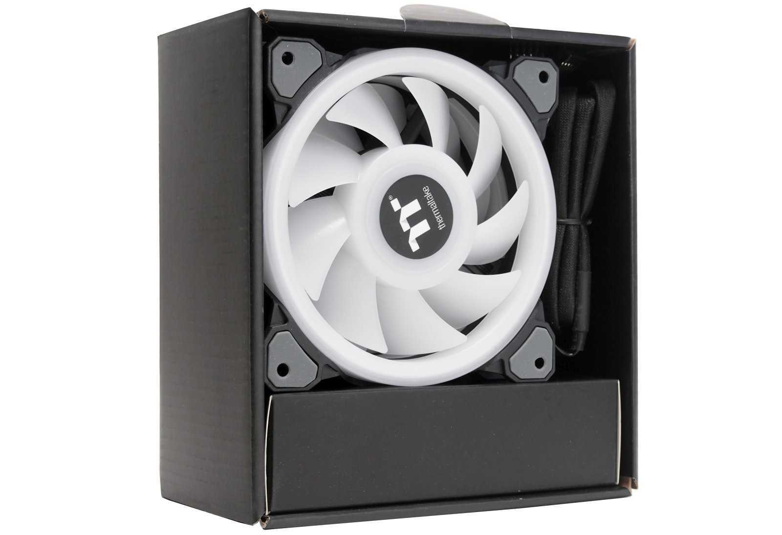 Комплект Riing Quad 12 RGB TT Premium включает в себя три 120 мм вертушки и аксессуары, заботливо уложенные в отдельный картонный кейс.