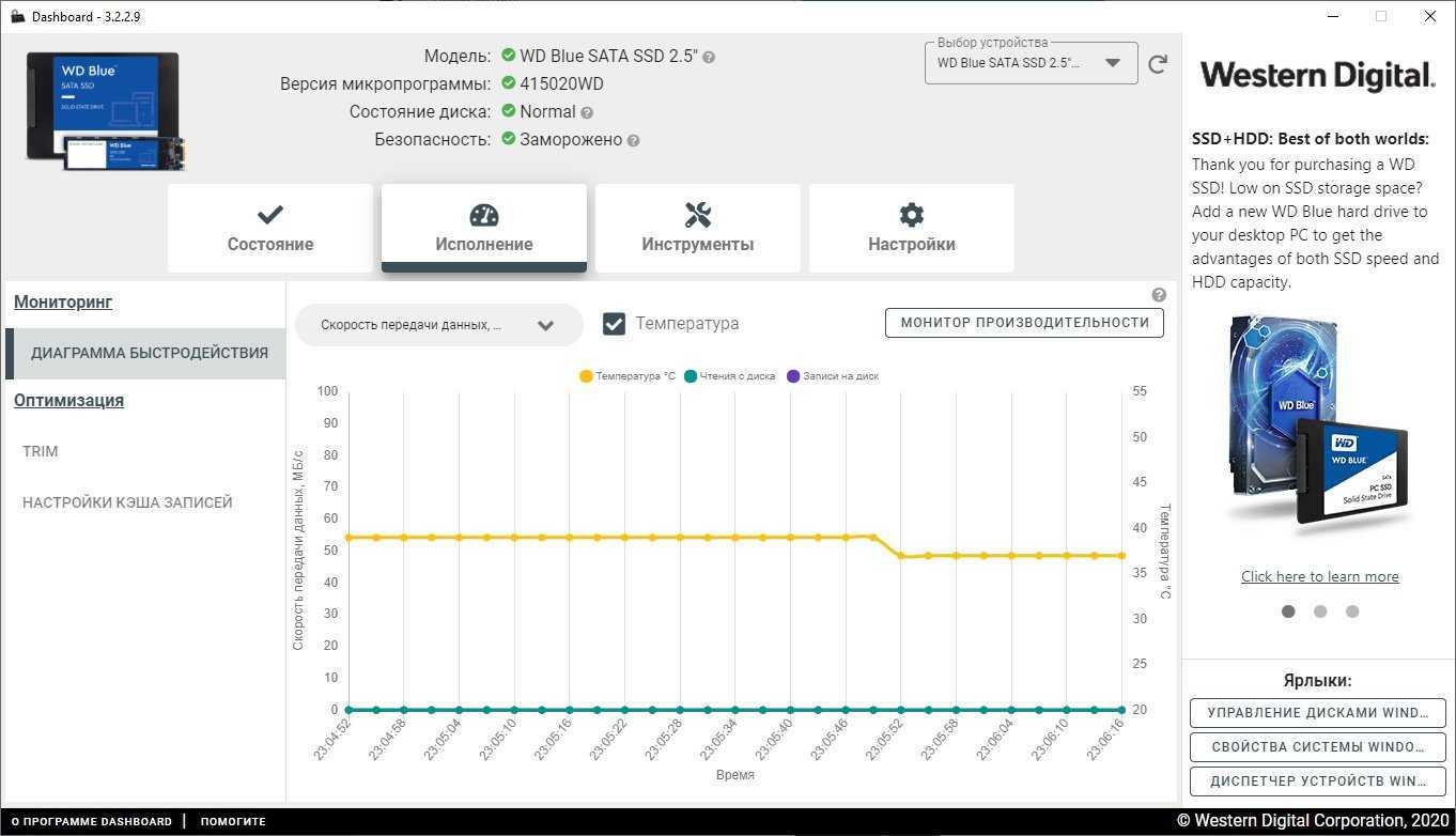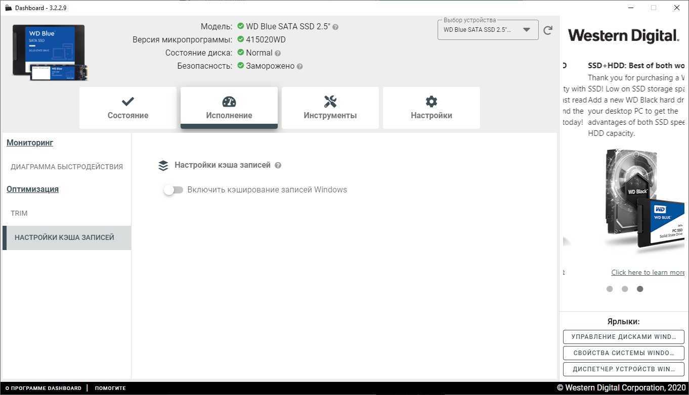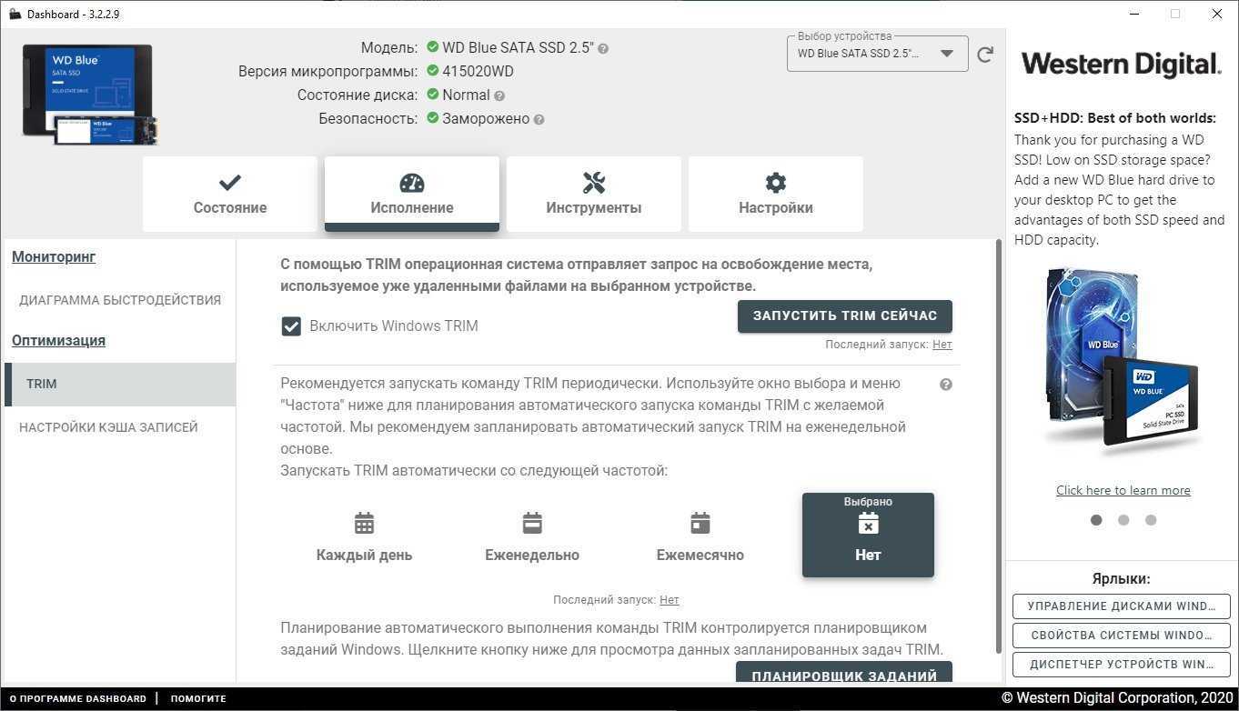На вкладке “Исполнение” пользователю доступна диаграмма быстродействия, настройка кэша записей, а также активация команды TRIM не только в ручном режиме, но и путем создания расписания.