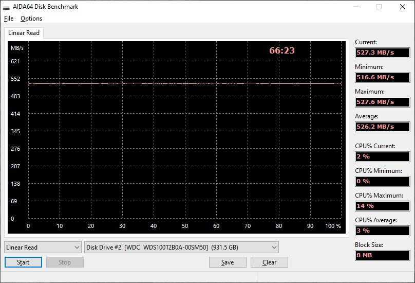 Средняя скорость линейного чтения равняется 526 МБ/с.