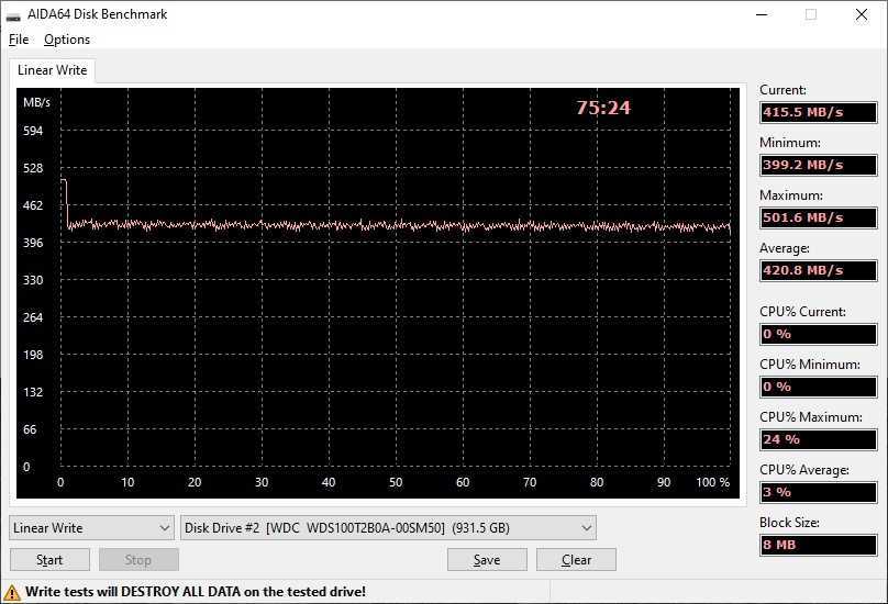 Тест линейной записи демонстрирует достаточно ровный график. Средняя скорость записи составила 420 МБ/с. Размер SLC-кэша примерно равен 8 Гбайтам.