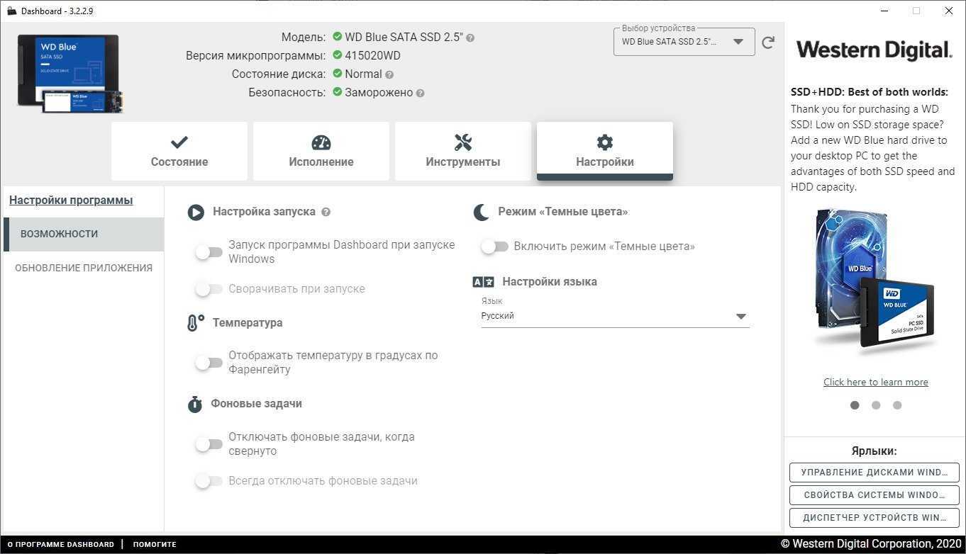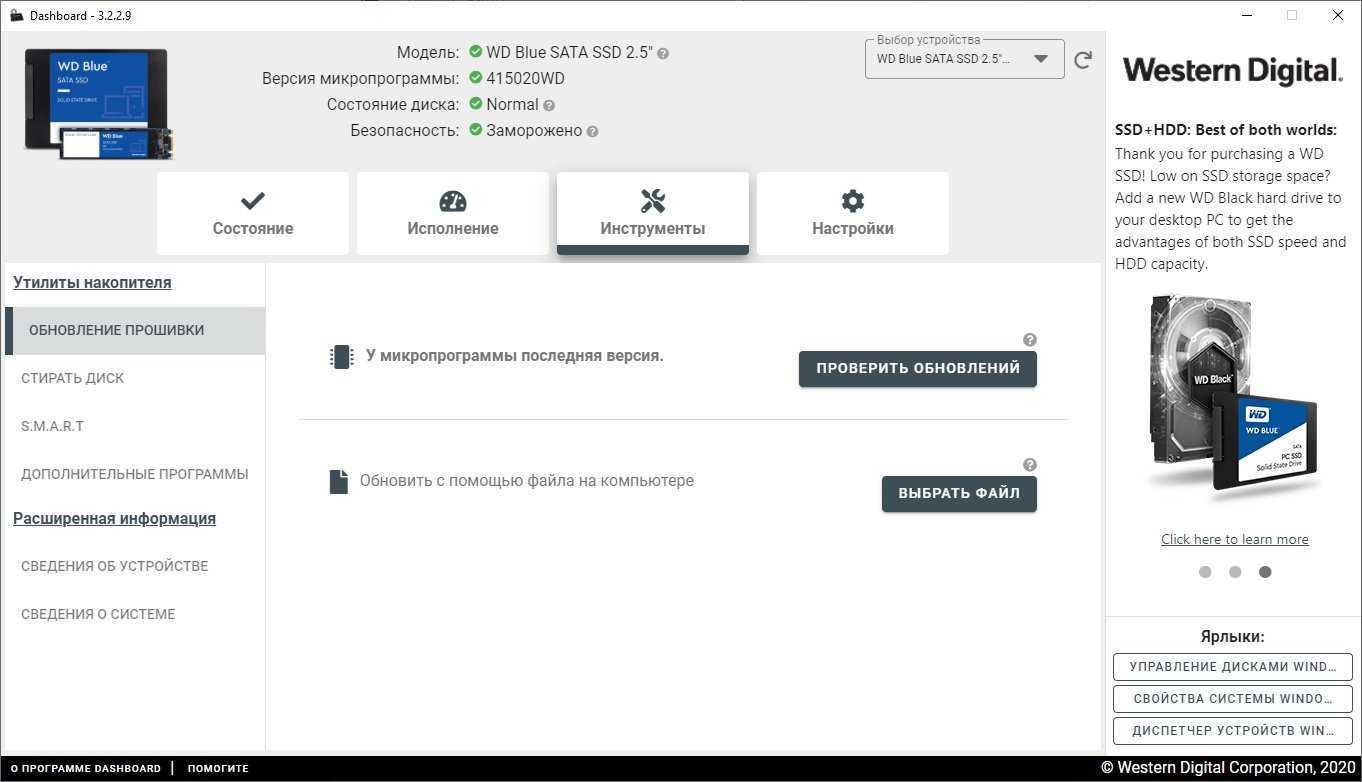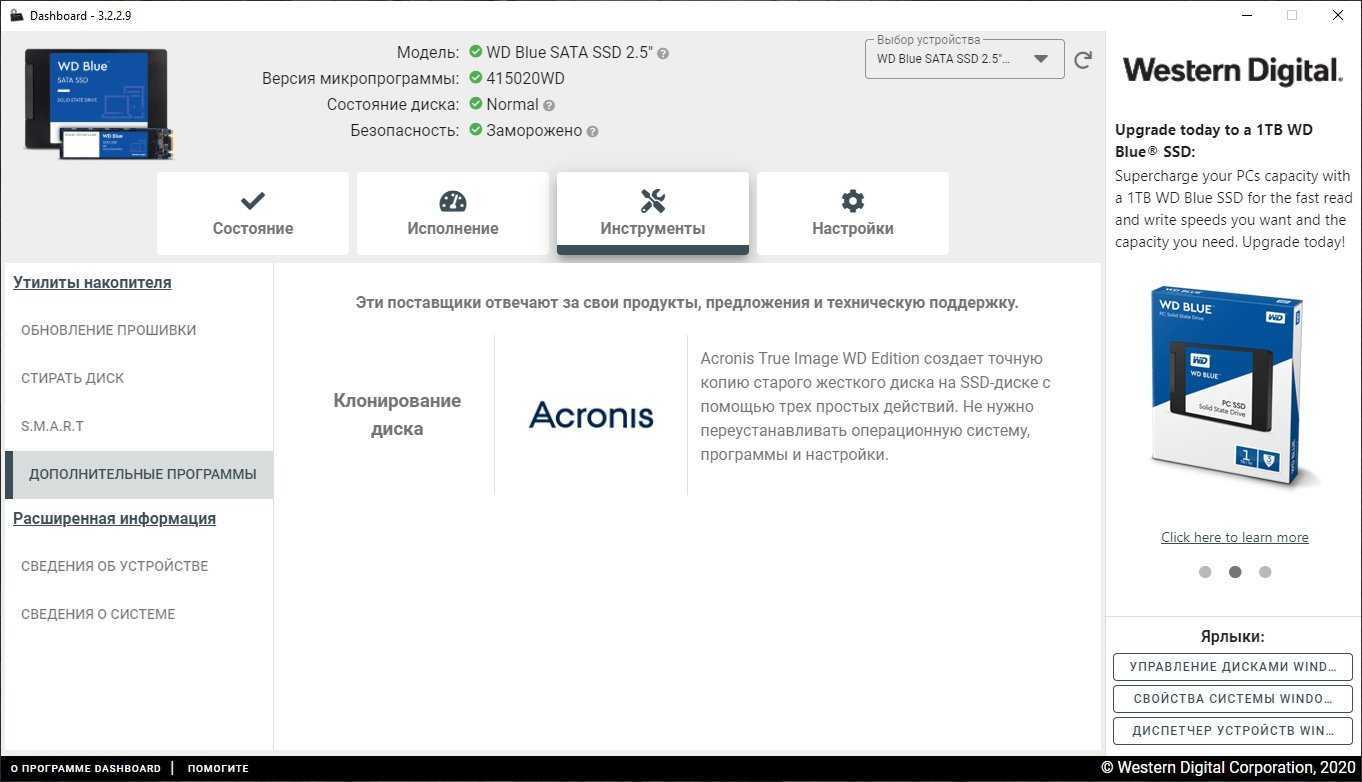 В панели “Инструменты” находятся инструменты для обновления прошивки, стирания диска и отображения состояния S.M.A.R.T. В пункте “Дополнительные программы” имеется возможность загрузить ПО для клонирования диска Acronis True Image WD Edition.