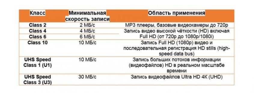 Ещё одним важным критерием является скорость работы. Для девайсов где нужна непрерывная запись в больших объёмах необходима большая скорость записи. Например, для записи 4К-видео нужна скорость от 30 Мб/сек, для FullHD видео – от 6 Мб/сек.
