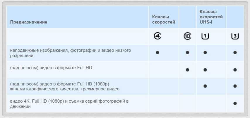 Для более требовательных видео- и фотокамер с записью видео Ultra HD 4K или 2K лучше всего подходят карты UHS Speed Class 3 (U3), где скорость записи не менее 30 МБ/с.