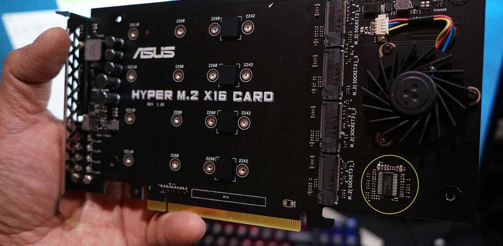 Рис 2.Плата-адаптер ASUS Hyper M.2 x16, желтым кружком выделена микросхема, предположительно являющаяся буфером-разветвителем тактового сигнала PCI Express Reference Clock