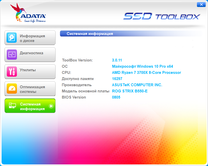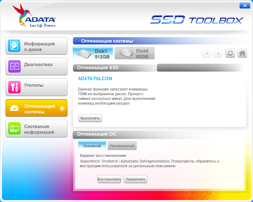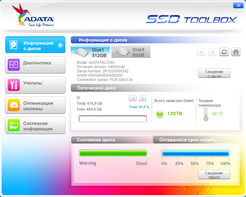 Утилита ADATA SSD ToolBox использует фирменный логотип радужного калибри и практически не претерпела изменения. Программа предоставляет информацию об объеме накопителя, его температуру, состояние здоровья, интерфейс, версию прошивки. Русскоязычный интерфейс достаточно неплох и позволяет легко ориентироваться на страницах программы.