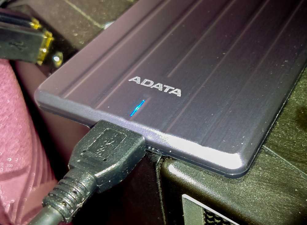 В остальном диск мало чем примечателен внешне. Надпись ADATA сверху, светодиодный индикатор рядышком, разъем USB 3.1 micro-B спереди. Снизу — шильдик со служебной информацией.