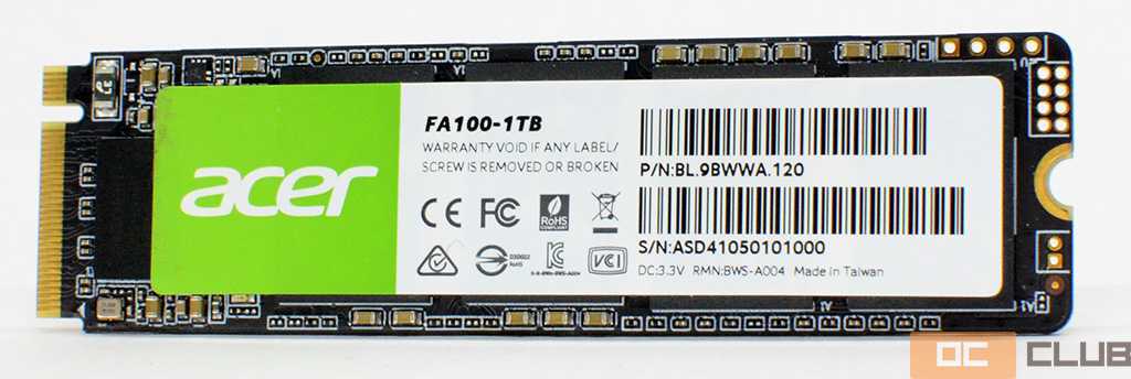 Во-первых, Acer FA100 – накопитель односторонний, то есть все компоненты распаяны с лицевой стороны. Тыльную сторону SSD совсем голой не оставили. Наклейка сзади не так проста. Под ней скрывается пластина из меди толщиной около 0,3 мм, немного помогающая в отводе тепла. Да, «напомогает» она не очень много, но всё же лучше, чем ничего. Здесь же стоит добавить, что эффективность теплоотвода сильно вырастет, если между накопителем и материнской платой положить дополнительную термопрокладку. Её необходимая толщина зависит от конкретной модели «материнки».