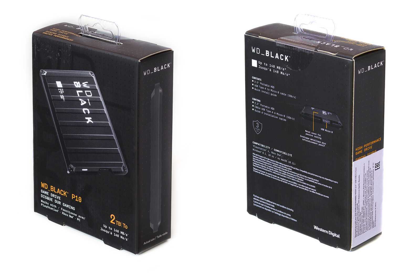 Накопитель поставляется в картонной коробке черного (что логично для серии Black) цвета с полиграфией. На фронтальной стороне упаковки изображено само устройство, наименование модели и емкость. На тыльной стороне можно увидеть список комплекта поставки и другую малоинтересную информацию.