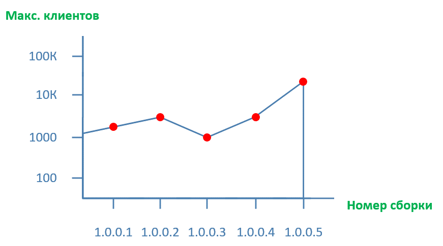 По горизонтали — номер сборки (билда) продукта, а по вертикали — индекс производительности, в нашем примере — какое макс. количество клиентов поддерживает один экземпляр серверной части продукта.