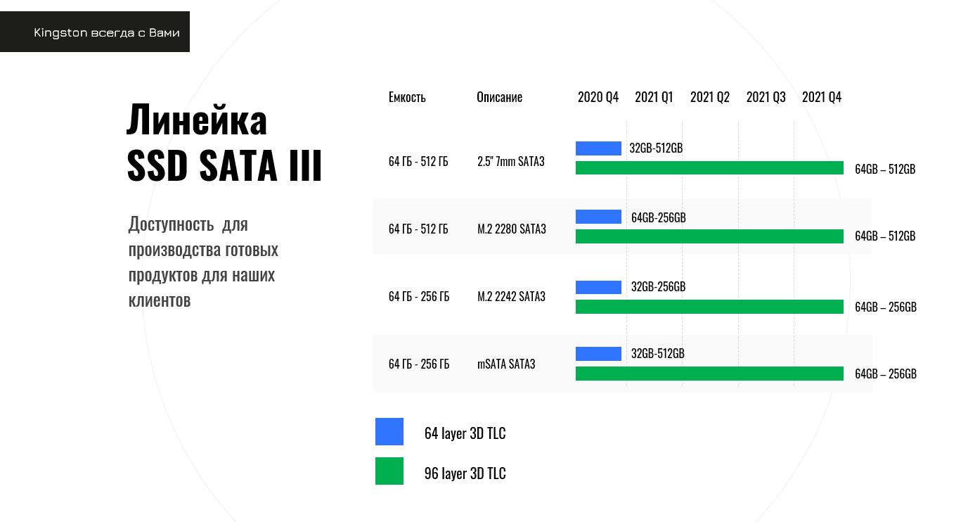Линейка SSD SATA III оптимальная для производства готовых продуктов. Все 4 типа производства SATA SSD: mSATA, 2,5 дюйма, M.2 2242 и M2 2280 имеют поддержку производителя.