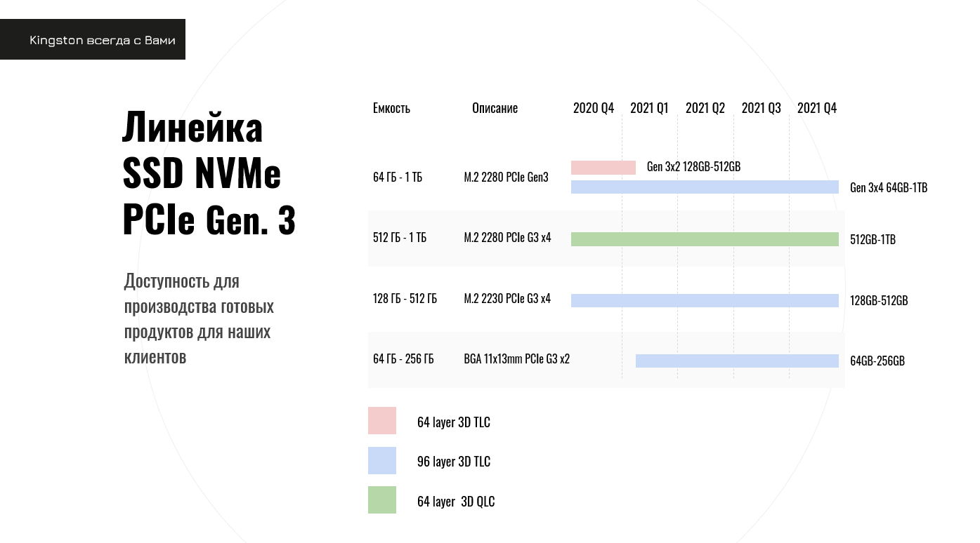 Компания расширит ассортимент моделей с контроллером, в которой для кэша SSD будет выделяться оперативная память. Для линейки NVMe Kingston определил нового поставщика NAND памяти.