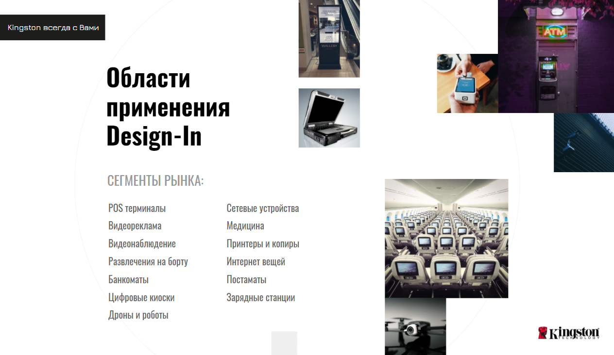 Цифровизация и роботизация способствуют расширению области применения SSD. Программа Design-In SSD используется в большей степени для специализированного оборудования: постаматов, зарядных станций, сетевых устройств, зарядных станций, интернет вещей, принтеров и копиров. Кроме того, среди сфер применения: медицина, банкоматы, цифровые киоски, развлекательные системы на борту авиалайнеров, а также видеонаблюдение, видеореклама, POS –терминалы. Этим устройствам необходим современный накопитель для загрузки служебных приложений и операционной системы, а также сбора информации и ее локального хранения.