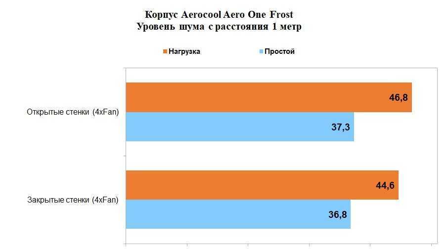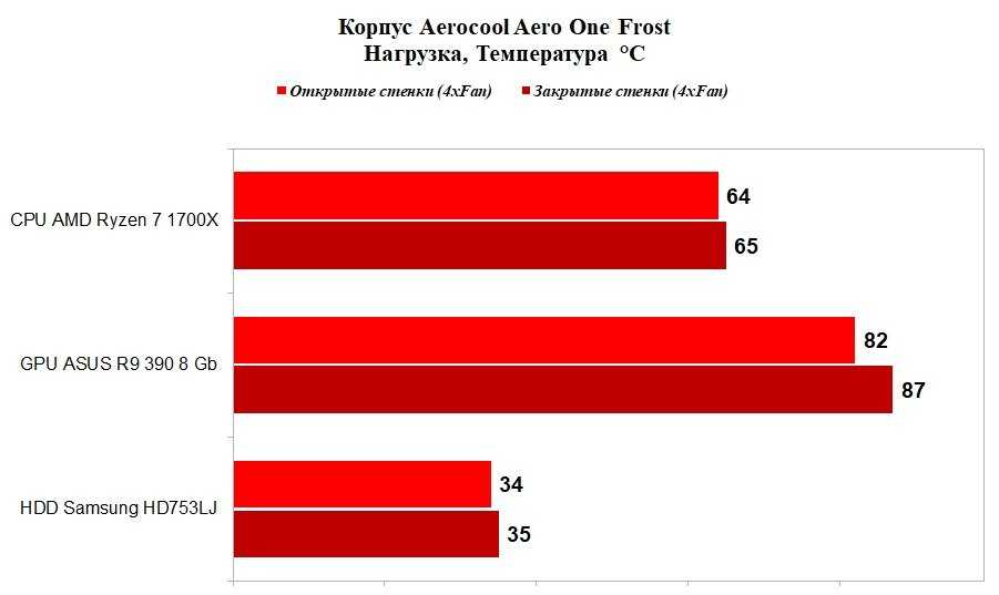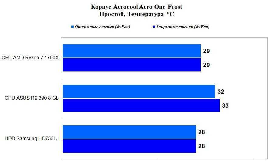 Четыре предустановленных 120 мм вентилятора Aerocool Frost делают свое дело. Разница температур в корпусе Aerocool Aero One Frost в простое с открытыми и закрытыми боковыми стенками практически отсутствует, а под нагрузкой она минимальная. Только для видеокарты получается разница 5 °С, что можно назвать отличным результатом (все-таки у нее система охлаждения большую часть нагретого воздуха рассеивает внутрь корпуса).