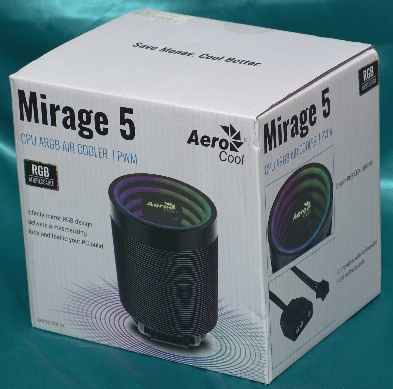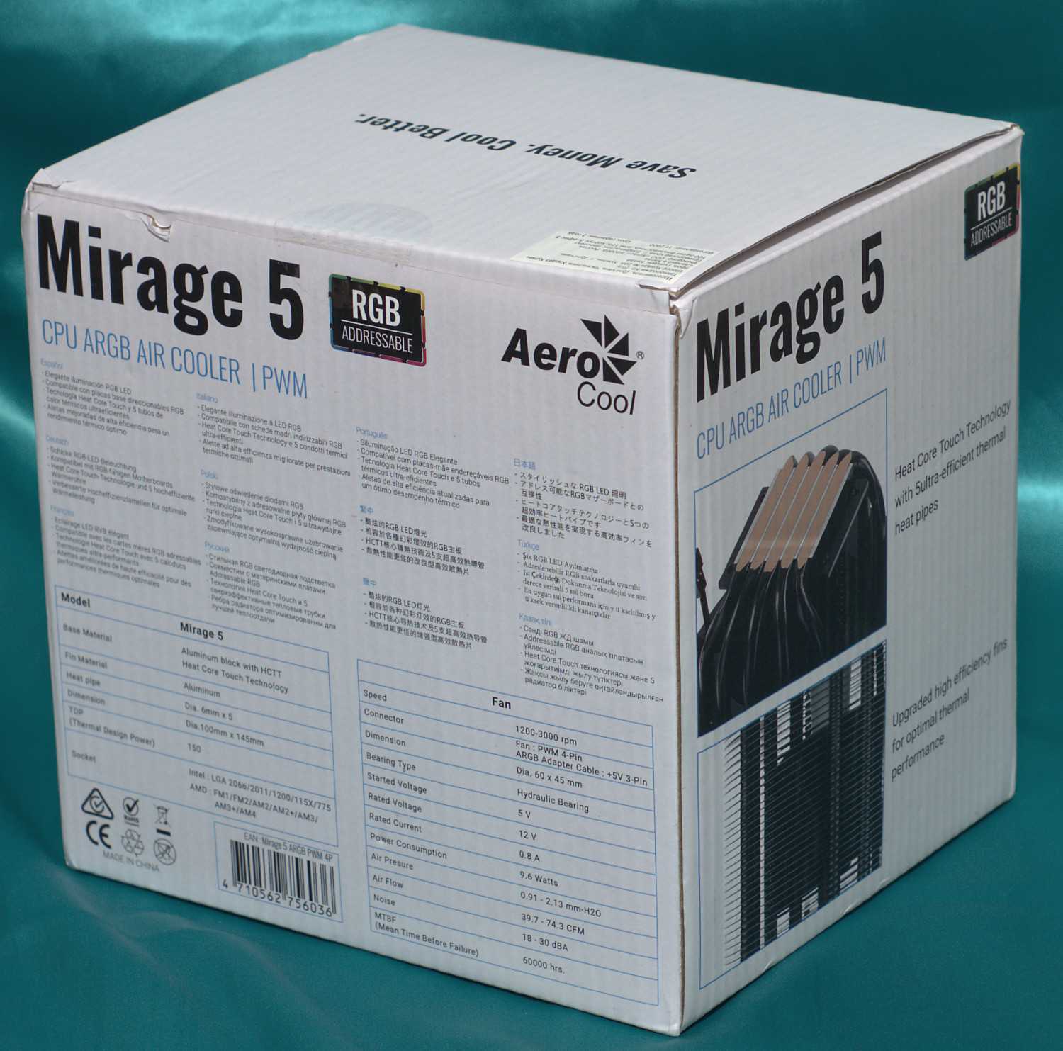 Белая коробка с Aerocool Mirage 5 содержит достаточное количество информации, чтобы понять, что кулер имеет необычную круглую конструкцию радиатора, пять тепловых трубок с технологией прямого контакта и ARGB-подсветку с эффектом бесконечности. Также на упаковке указаны его технические характеристики и присутствует многоязычное описание.