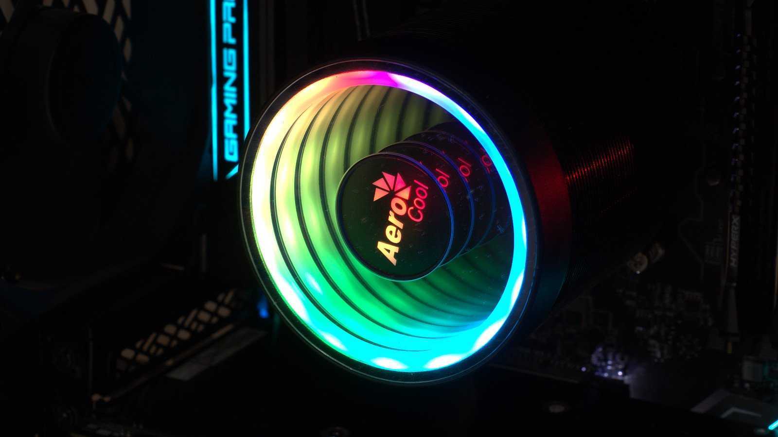 Высота кулера Aerocool Mirage 5 в 145 мм и диаметр 100 мм позволяют говорить, что он поместится в подавляющем большинстве Mid-Tower корпусов, а наличие ARGB-подсветки с эффектном бесконечности и возможностью синхронизации работы с материнской платой обеспечит эффектный внешний вид системе. Лучше, конечно, видеть вживую, но и на фотографии хорошо заметен зеркальный эффект работы подсветки «бесконечность».