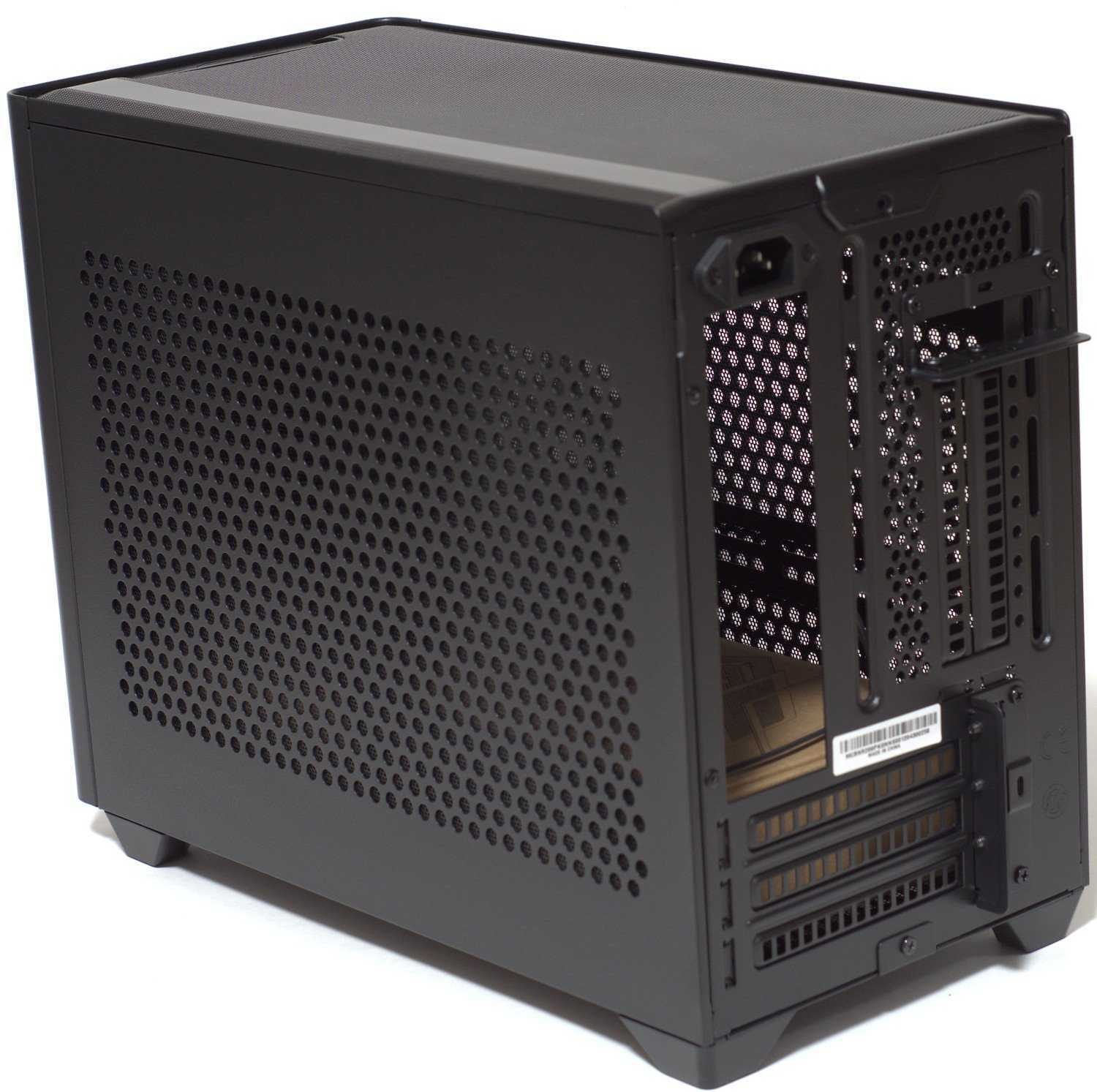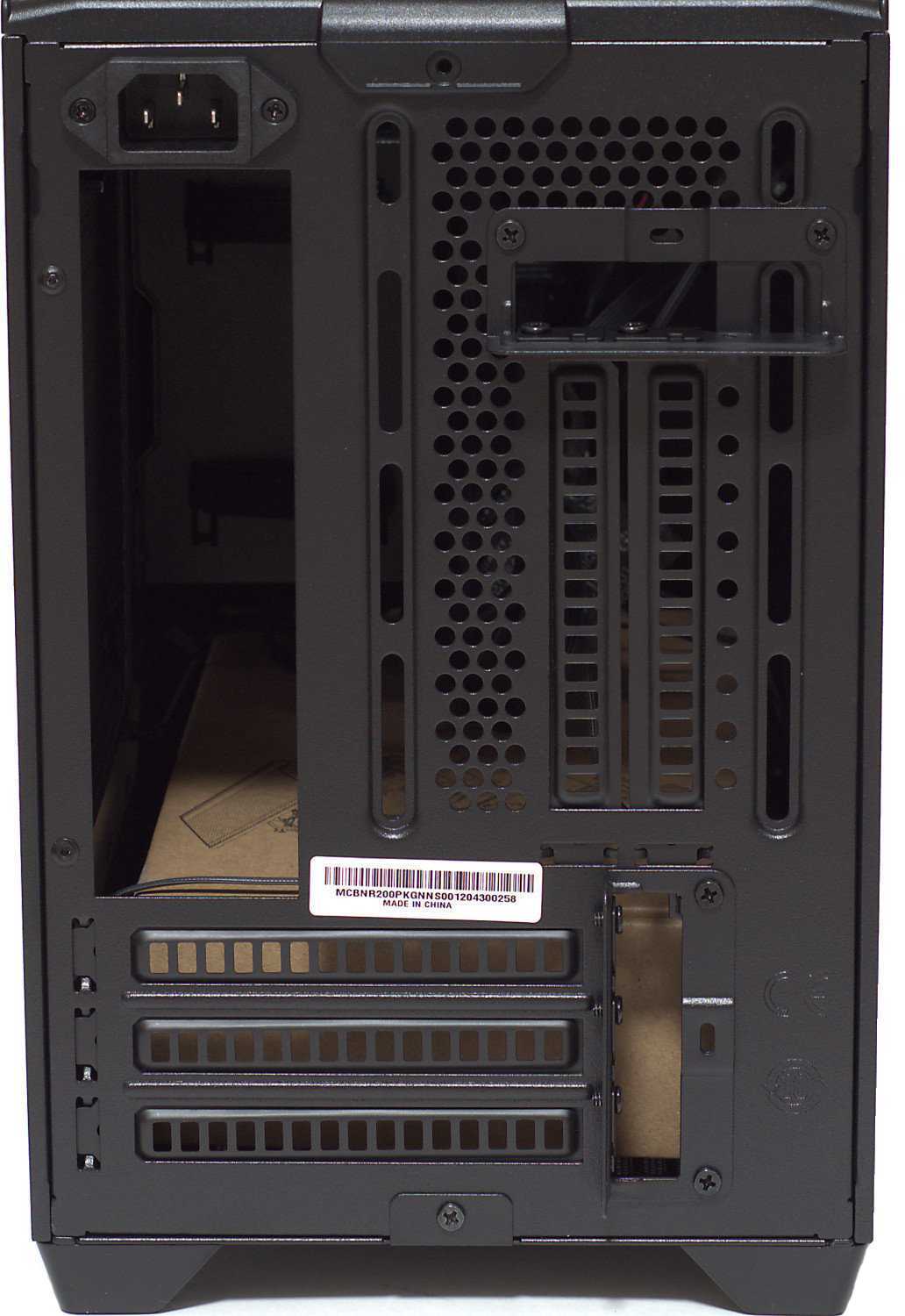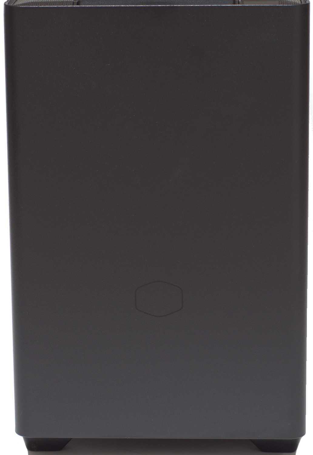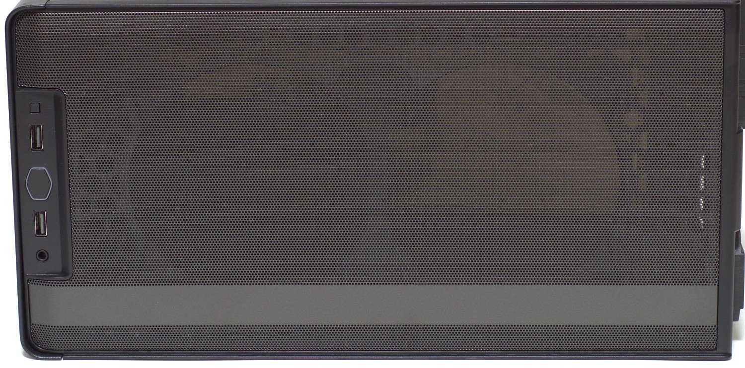 Причина таких размеров кроется в особенностях конструкции, которые хорошо видны по организации задней части – корпус допускает установку трехслотовой видеокарты в горизонтальном положении и двухслотовой в вертикальном. Из «необычного» выделим отсутствие места размещения блока питания, так как разъем для подключения кабеля питания уже размещен в левом верхнем углу. Передняя панель монолитная и на ней присутствует логотип компании Cooler Master (без названия).
