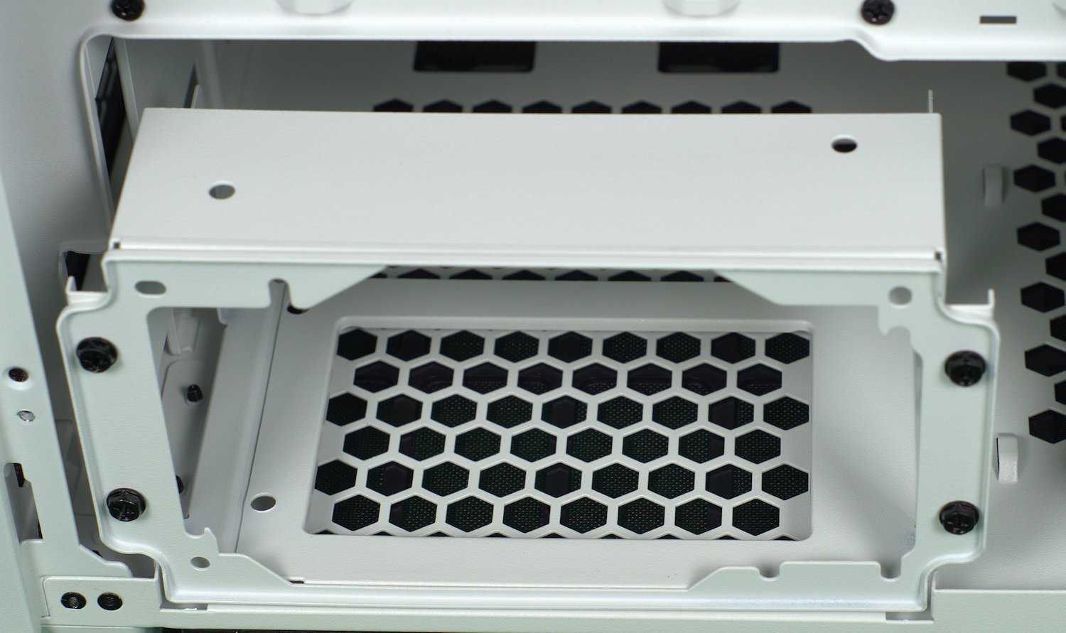 В корпусе также присутствует кожух, представляющий собой практически сплошную зону перфорации и выемку для установки длинной видеокарты. На нем допускается размещение одного 120/140 мм вентилятора.