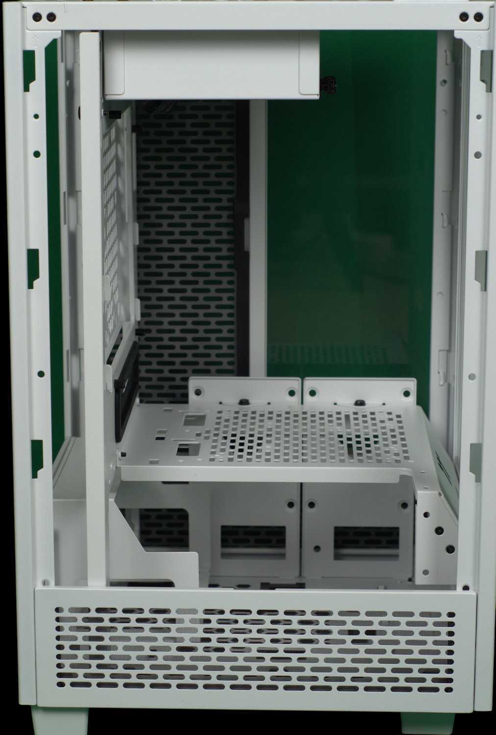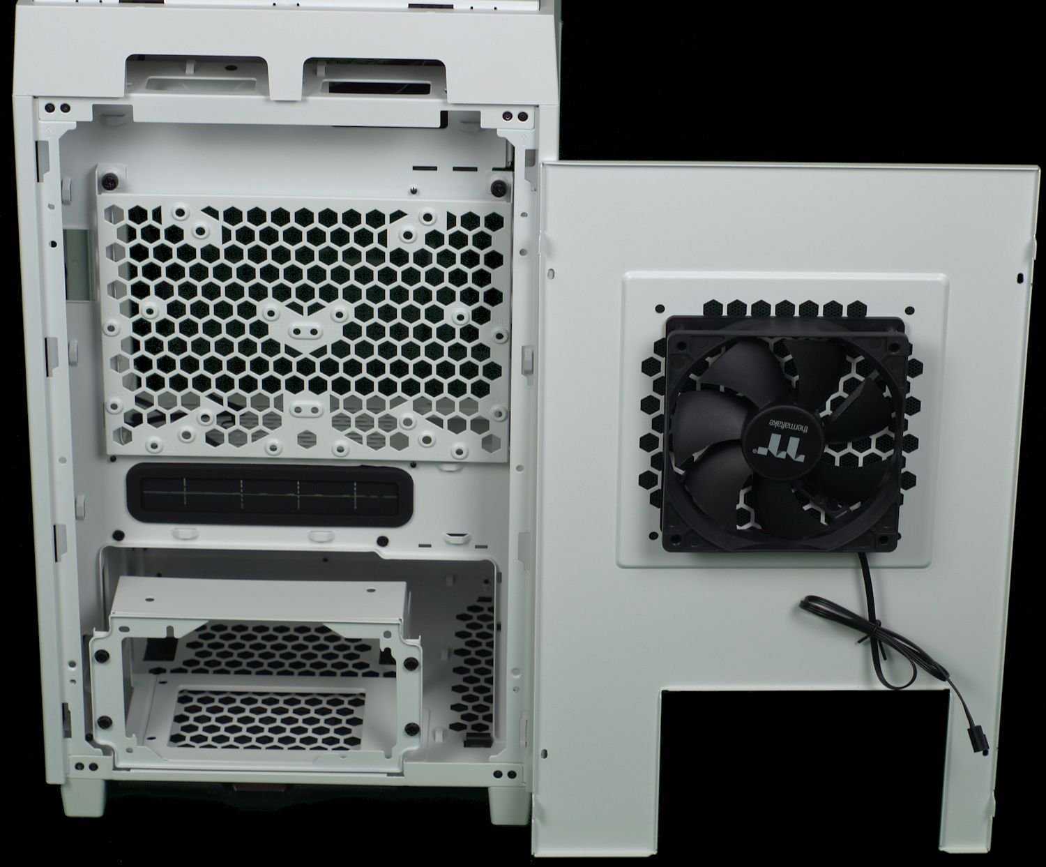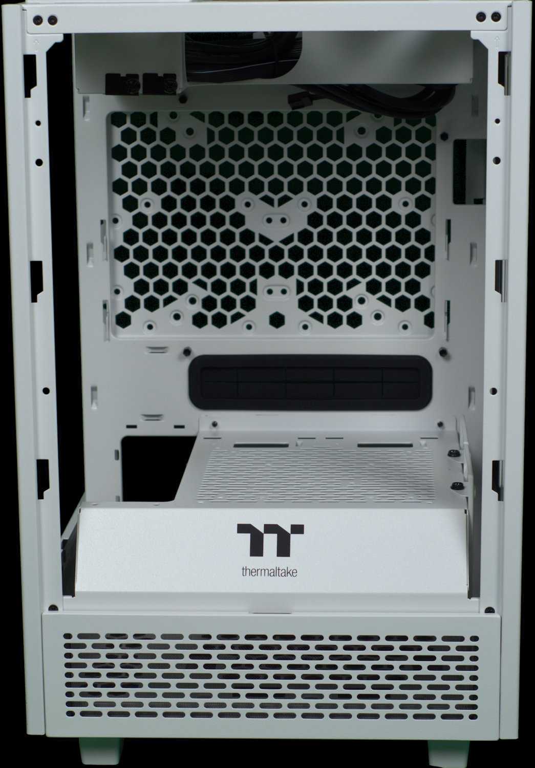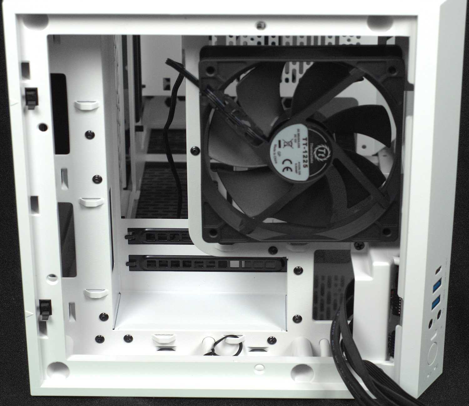 Оригинальная конструкция Mini-Tower корпуса Thermaltake The Tower 100 Snow Edition бросается в глаза при открытии верхней панели, которая с внутренней стороны имеет противопылевую сетку. Панель скрывает окно установки заглушки материнской платы, два отсека для установки видеокарты и предустановленный 120 мм вентилятор Thermaltake TT-1225 (вместо него возможна установка 140 мм вентилятора или 120 мм радиатора системы жидкостного охлаждения). Именно в эту область подводится большинство кабелей. Кстати, высота устанавливаемых USB-флешек/ресиверов может быть до 8 см.