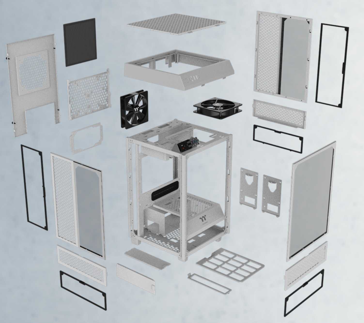 В этом плане интересным вариантом является Mini-Tower корпус Thermaltake The Tower 100 Snow Edition, который за счет трех панелей из закаленного стекла позволяет продемонстрировать внутренности с оригинальным размещением комплектующих (порты ввода-вывода материнской платы mini ITX «смотрят» вверх, видеокарта установлена с разворотом на 90 градусов).