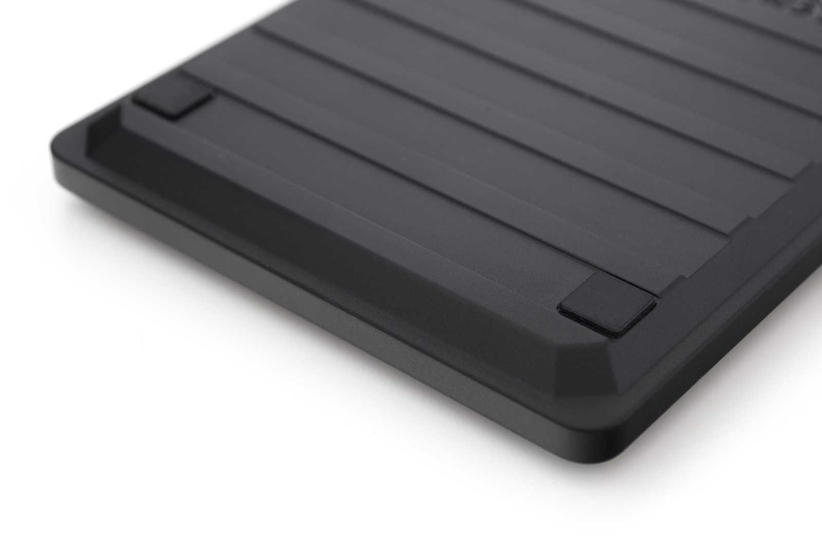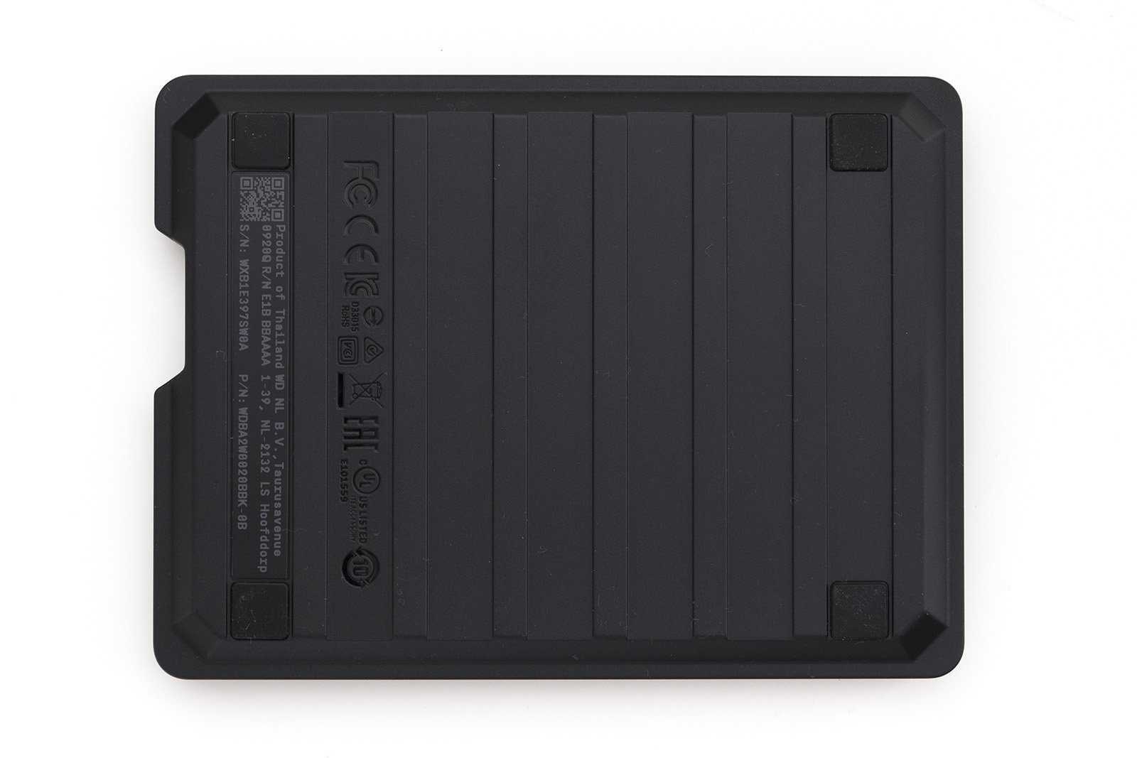 Жесткий диск имеет четыре небольшие резиновые ножки. Благодаря им, WD_Black P10 надежно фиксируется на поверхности, исключая проскальзывание.