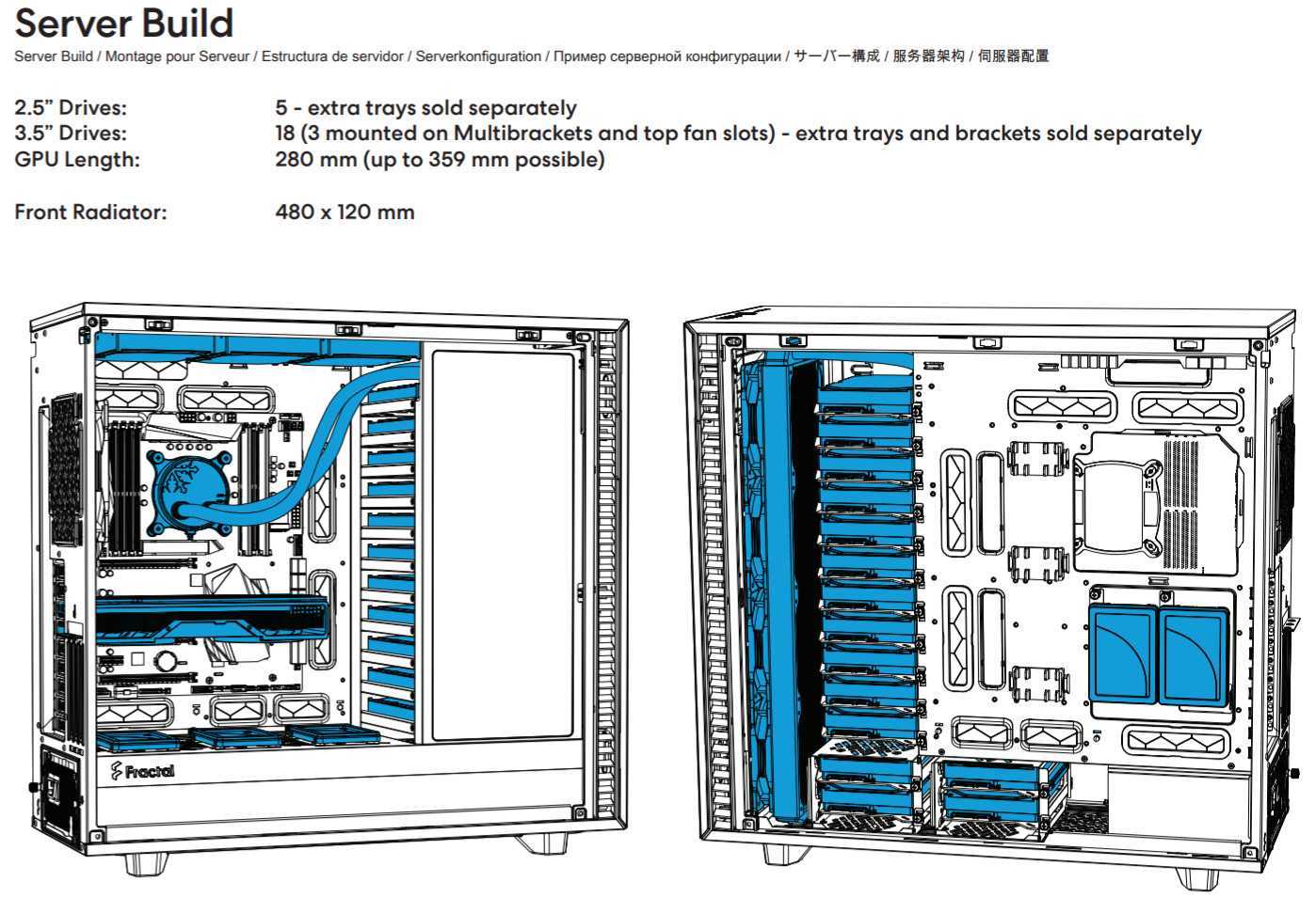 Вместе с тем, что корпус достаточно вместительный и позволяет установить материнскую плату вплоть до форм-фактора E-ATX, длинные видеокарты (в зависимости от конфигурации от 280 мм до 491 мм), кулеры высотой до 185 мм, нескольких крупных радиаторов до 280/360/420 мм; его можно легко модифицировать под конкретные потребности, в частности серверного варианта с большим количеством накопителей (до 13 х 3.5″ и до 4 х 2.5″), правда в комплекте салазок только шесть на 2.5″/3.5″ и две на 2.5″.