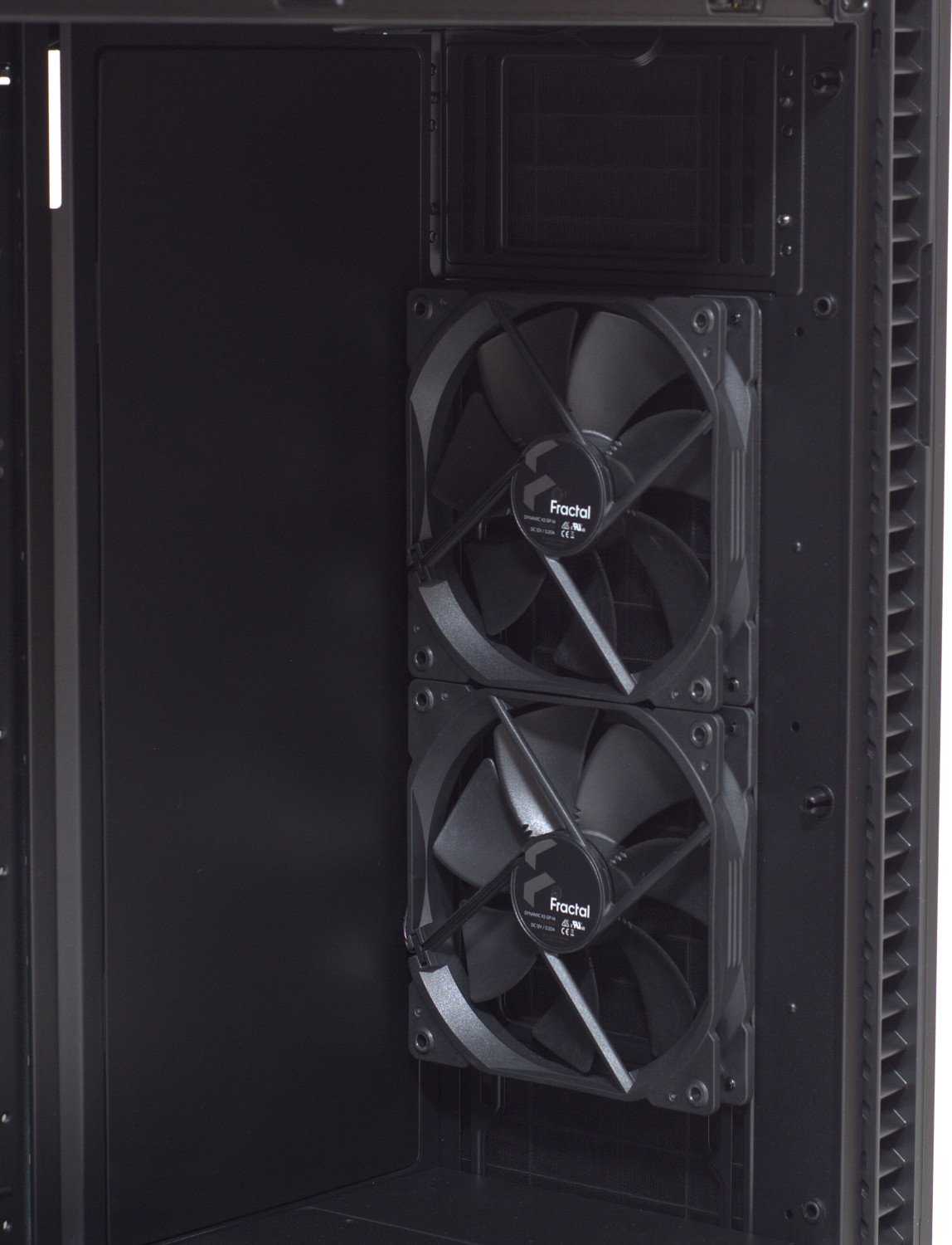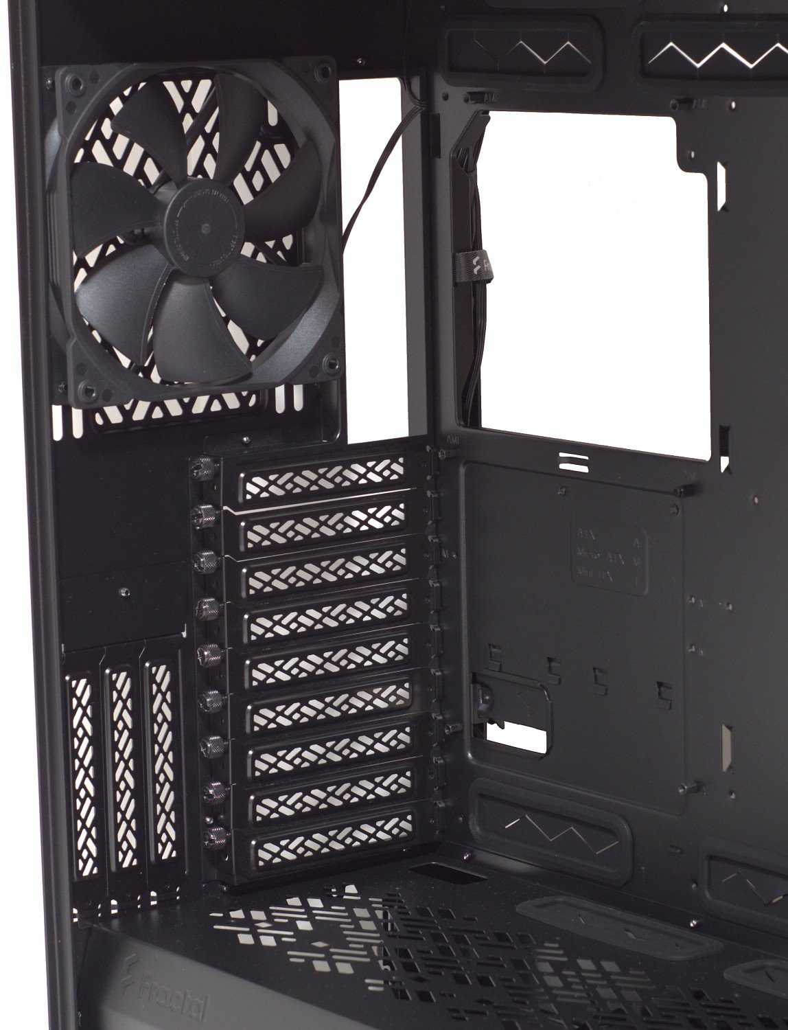 Компоновка задней стенки выделяется наличием девяти горизонтальных и трех вертикальных отсеков для установки плат расширения. Для вертикальной установки потребуется райзер-адаптер Flex VRC-25, который не входит в комплект поставки. Что еще можно отметить, так это один предустановленный 140 мм вентилятор Dynamic X2 GP-14 (1000 rpm). Еще два установлены спереди, причем заметно, что вверху есть пространство для установки корзины под два 5.25″ оптических привода (и она есть в комплекте). Если их не использовать, то можно установить весьма крупный радиатор системы жидкостного охлаждения (до 480 мм) или 4х120 мм вентилятора.