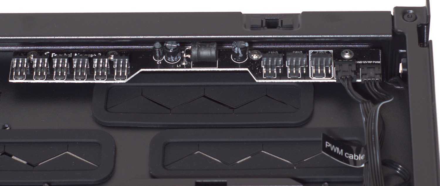 К месту приходится компактный хаб Nexus+ 2 на 9 вентиляторов (6х3-пин и 3х4-пин), расположенный в верхней части корпуса. Питание идет через SATA-разъем, а управление оборотами можно осуществлять через PWM-разъем, подключаемый к материнской плате. О чем надо помнить, так это о большой длине, поэтому кабели питания вентиляторов, особенно расположенных спереди, должны быть достаточной длины для их подключения к хабу. Варианта ручной регулировки оборотов в корпусе не предусмотрено.