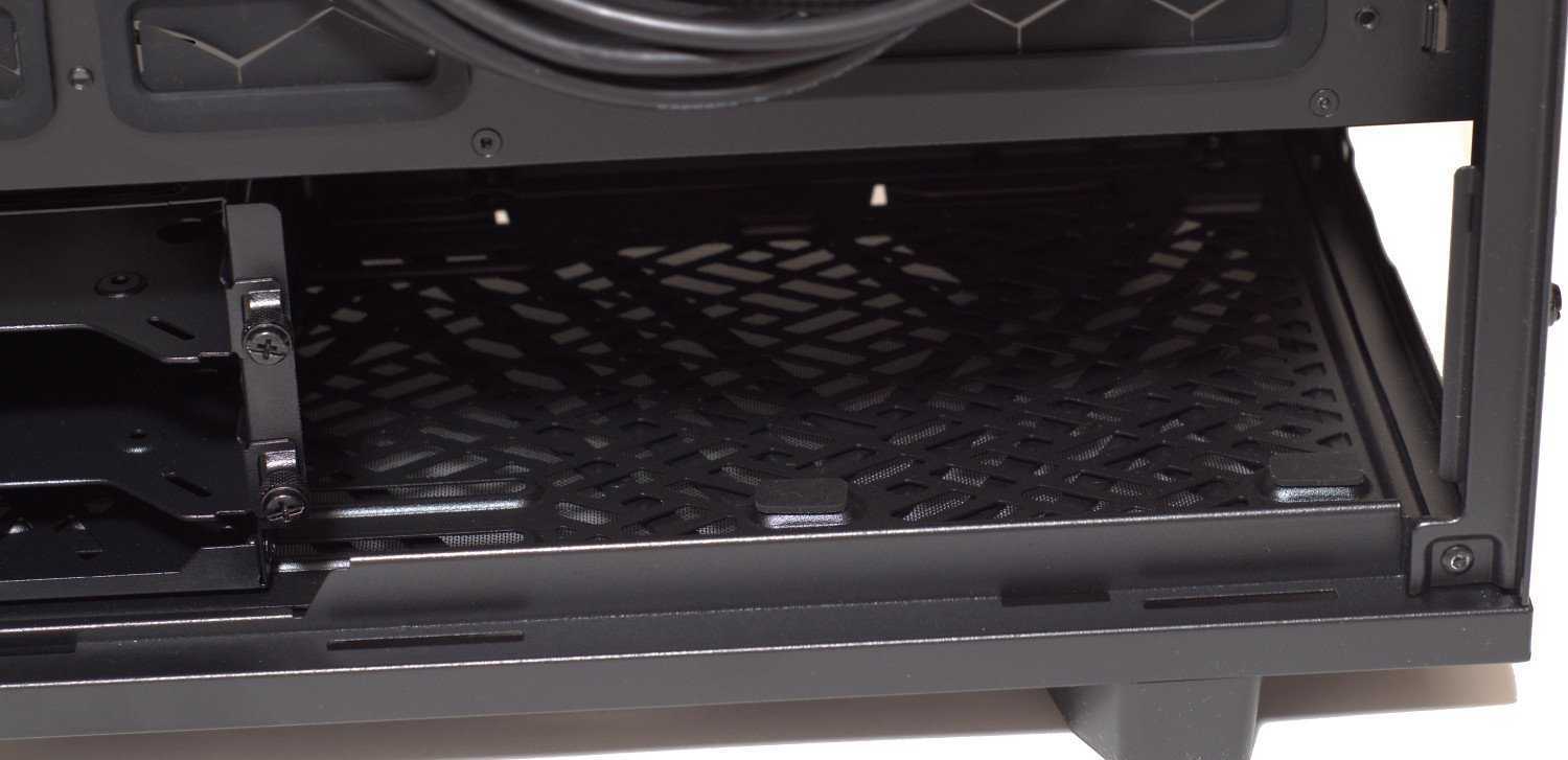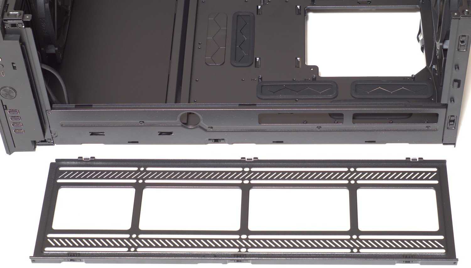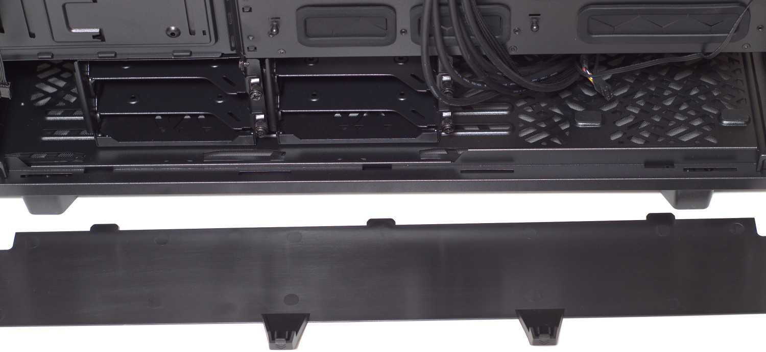 За панелью скрыто место размещения ATX блока питания и две корзины на 2х2.5″/3.5″ накопителя. Вместо корзин снизу можно установить дополнительные вентиляторы/радиатор СЖО (2х120/140 мм или 240/280 мм радиатор).