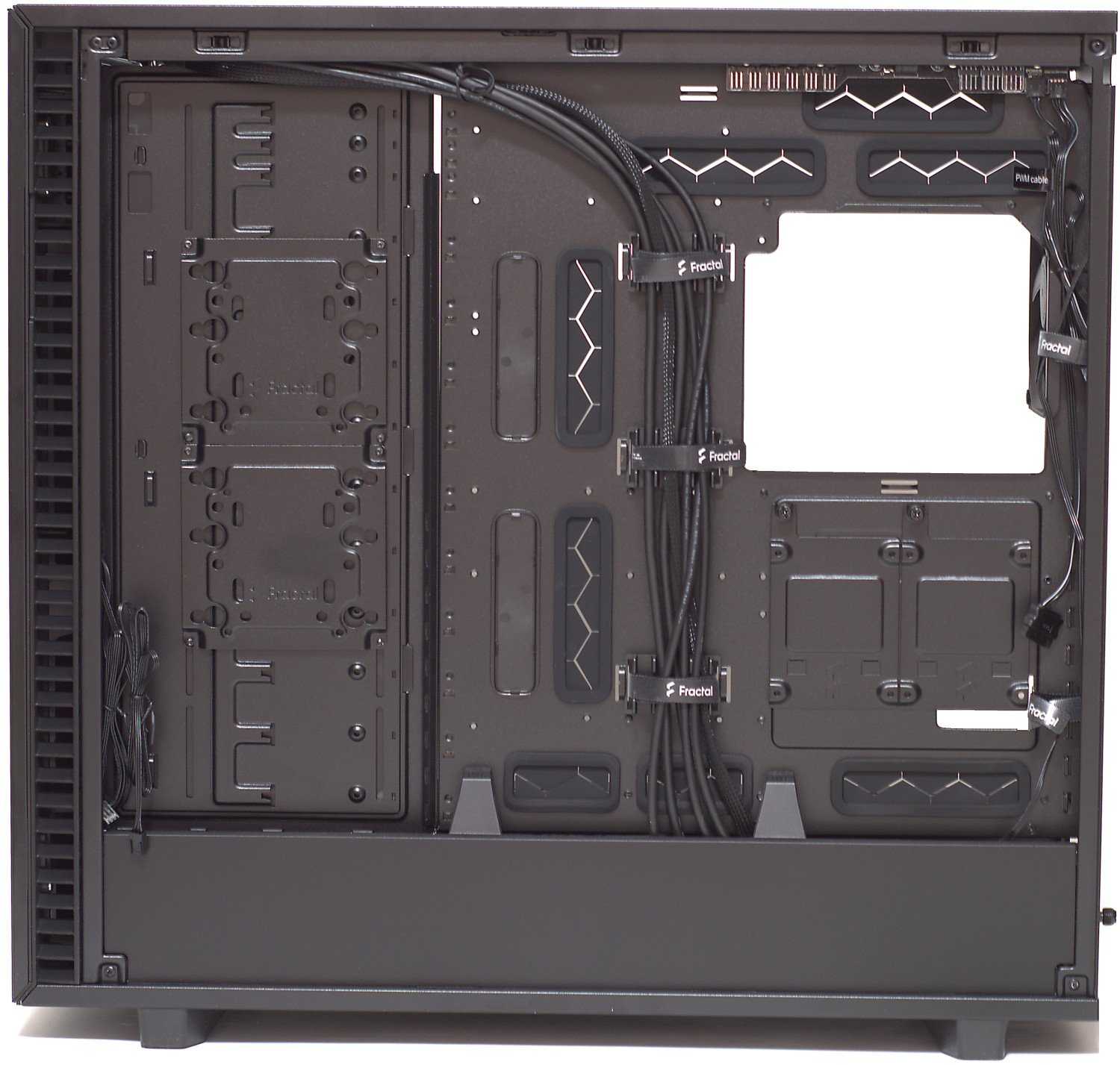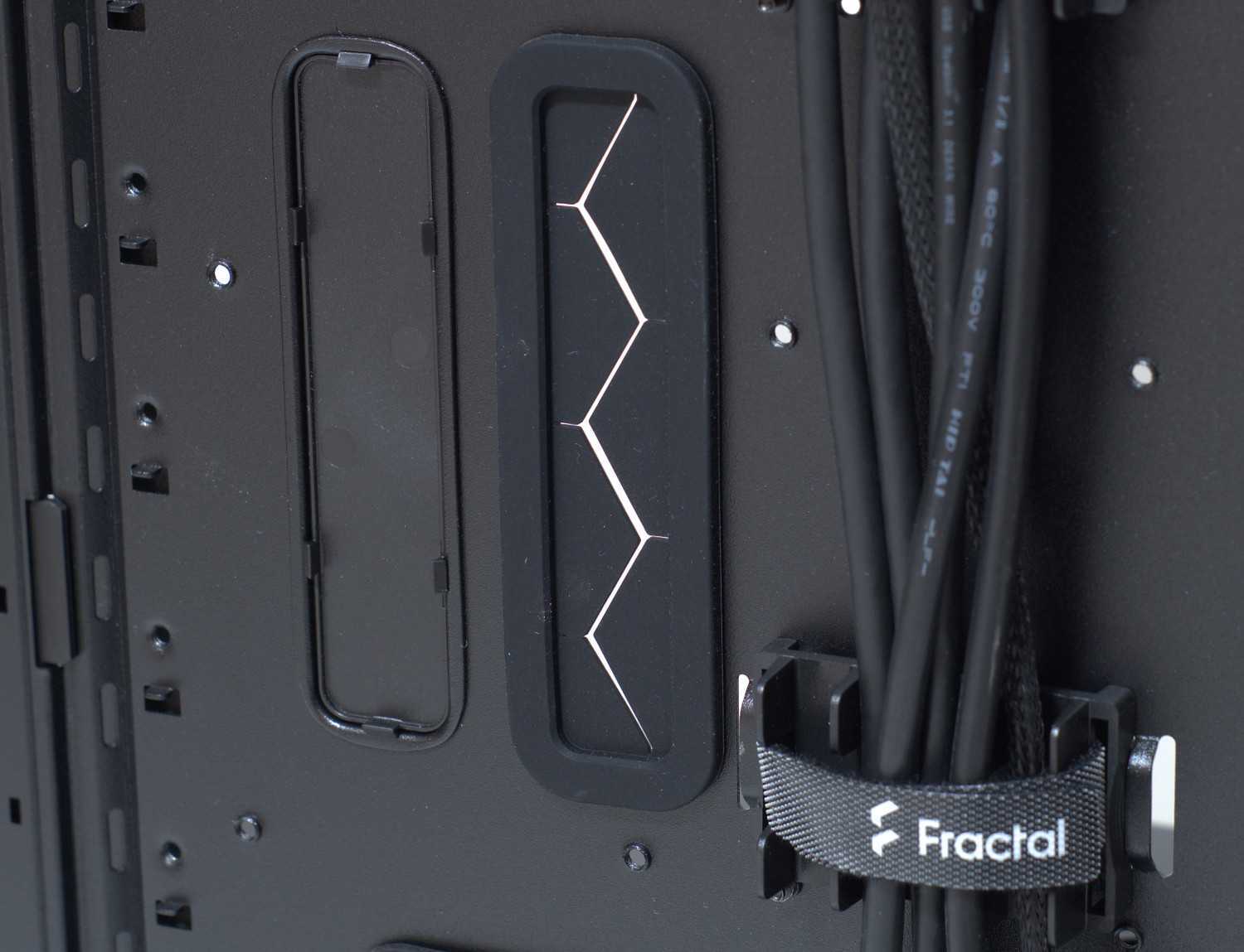 Система кабель-менеджмента в корпусах серии Define 7 продвинутая. Для удобства укладки кабелей в корпусе имеются пластиковые направляющие. Плюс при установке крупных EE-ATX/SSI-CEB/SSI-EEB материнских плат в поддоне имеются дополнительные окна. Некоторые из них закрыты пластиковыми заглушками и при необходимости они переставляются в соседние окна, а вместо них устанавливаются резиновые заглушки.