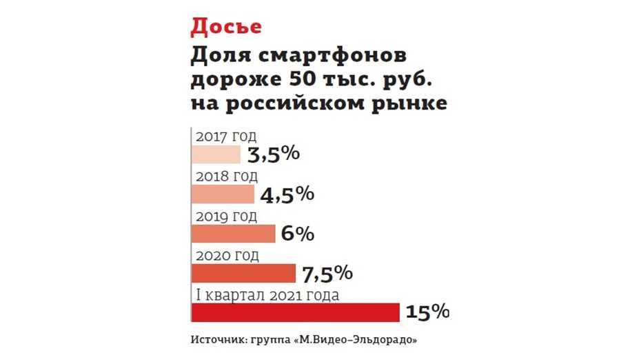 Действительно, в «М.Видео–Эльдорадо», например, сообщают: «По итогам первого квартала 2021 года продажи смартфонов из верхнего ценового диапазона показали наиболее высокую позитивную динамику. Спрос увеличился на 70% в штуках и 85% в деньгах. В результате доля устройств дороже 50 тыс. рублей увеличилась в штуках вдвое, до 15% от общего объёма продаж, в деньгах приблизилась к 50%». Однако вместе с этим и цена устройств выросла до 20%.