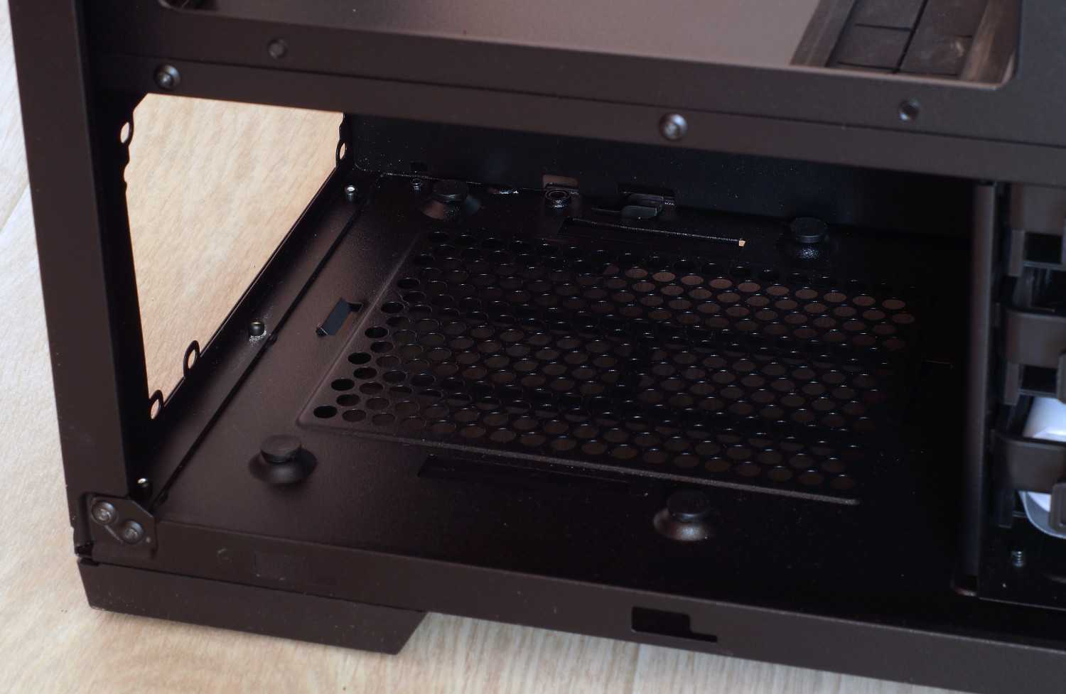 Дно корпуса также содержит перфорацию в области размещения блока питания с противопылевым фильтром. Частичный приток воздуха спереди будет обеспечиваться через широкое отверстие, которое является «ручкой» для снятия лицевой панели.